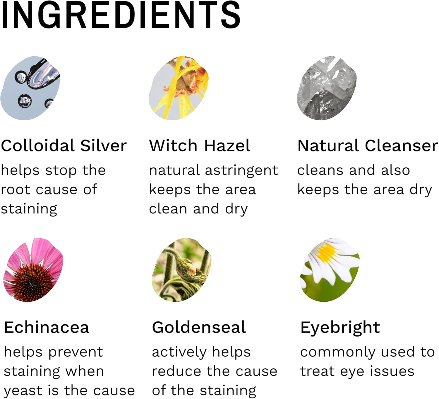 - REMOVE TEARS: Safely remove tear stains with non-irritating and 100% natural ingredients including Colloidal Silver. Remove tear stains in 7 days with daily use. For tear free eyes, use weekly once original tear stains are removed. Apply directly around the eyes and between skin folds.