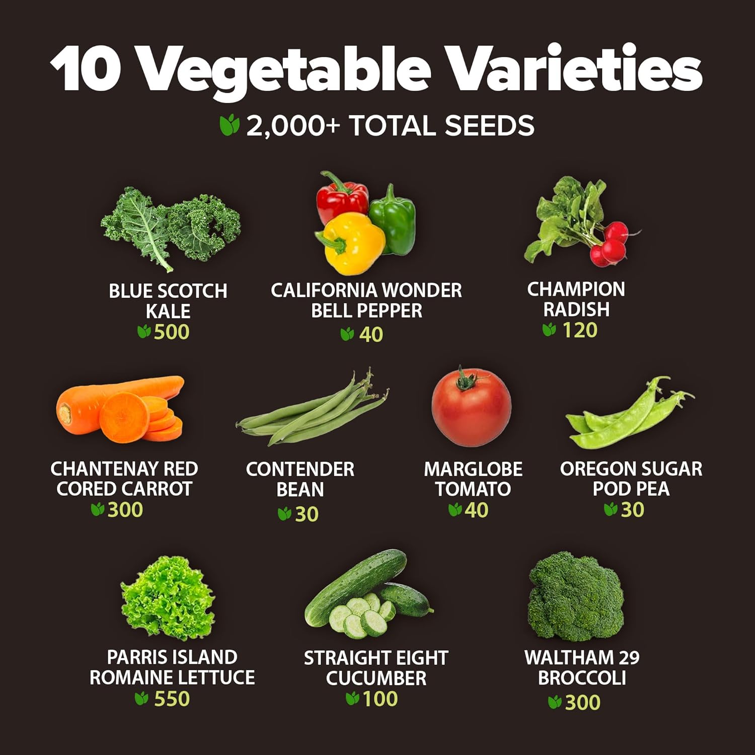 - Perfect Selection of Vegetables for Your Family Garden - Included in each pack you will get the top Heirloom Vegetable varieties. Each pack includes varieties such as Contender Beans, Waltham Broccoli, Blue Scotch Kale, Oregon Sugar Peas, Marglobe Heirloom Tomatoes, Black Beauty Summer Squash, and many more. You can't go wrong with these culinary favorites.