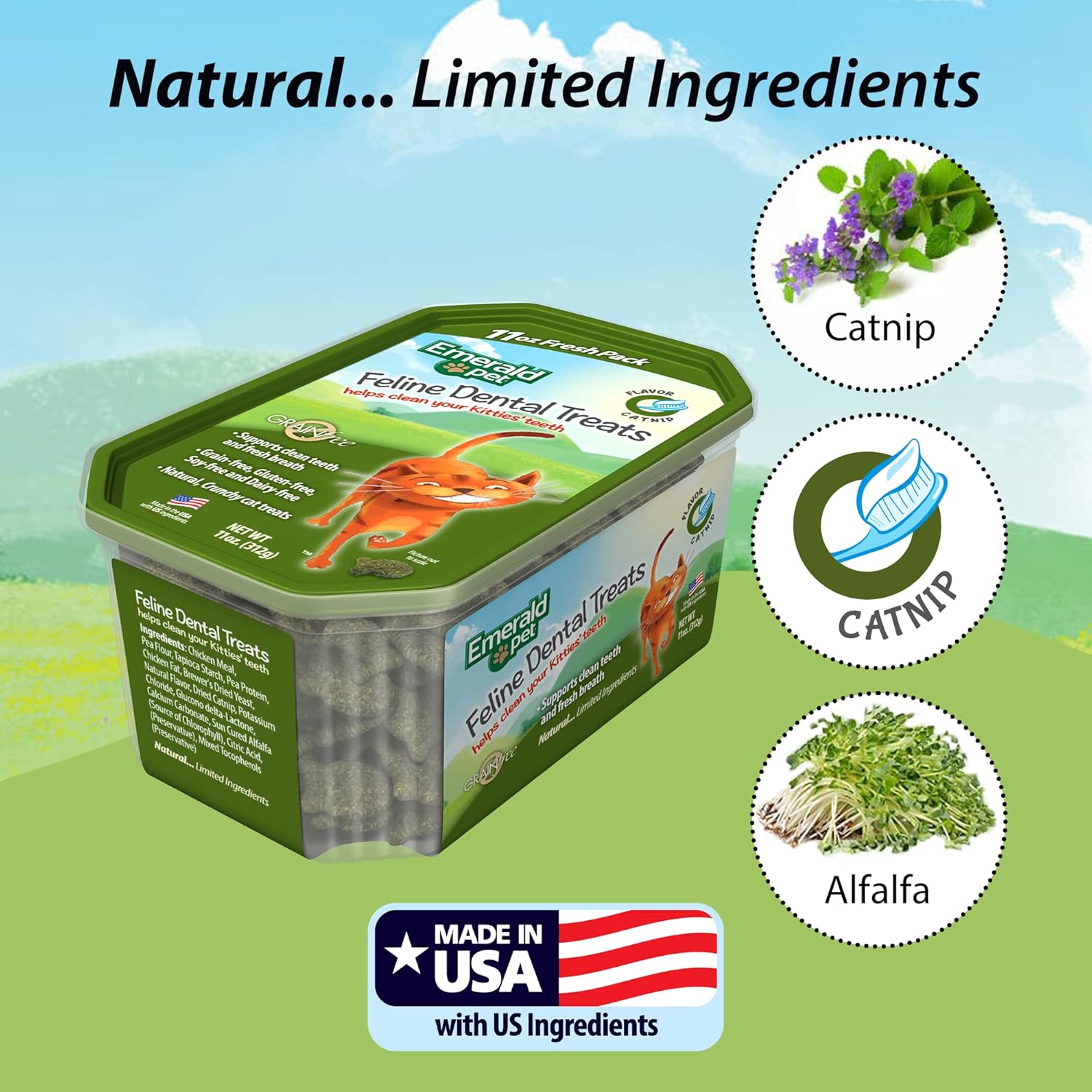 - NATURAL AND LIMITED INGREDIENTS THAT HELP CATS LIVE A HEALTHIER LIFE — Emerald Pet's grain free dental cat treats are made with natural and limited ingredients specializing in allergen concerns so cats can live a happy and healthy life with their pet owners. These healthy kitty treats contain no sugars, salt, or by-products but still taste amazing. All Emerald Pet products are made right here in the USA with premium US-sourced ingredients.