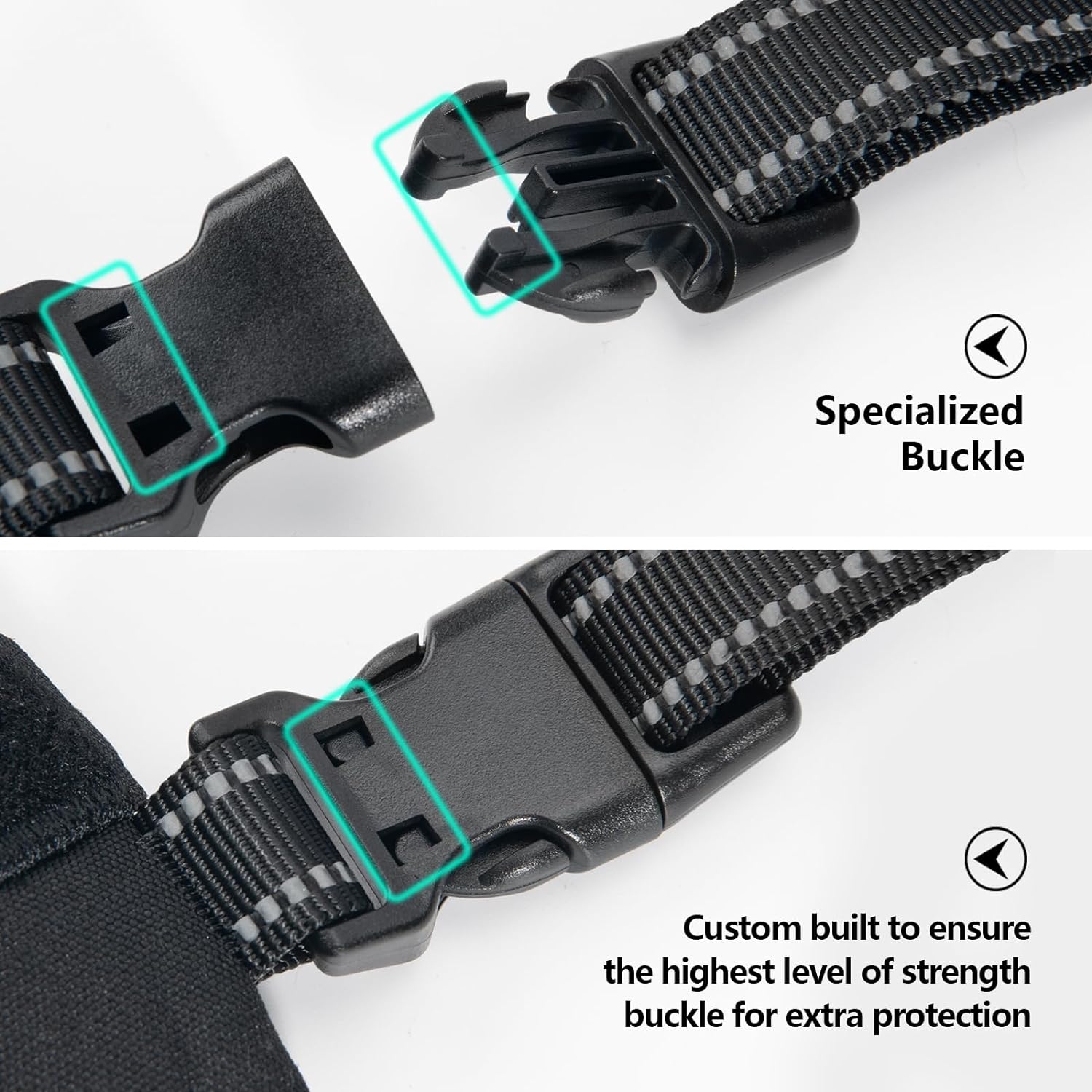 - [EASY TO PUT ON & TAKE OFF] This harness is easy to put on and take off with its 3 Fast-release Buckles. This dog harness has 3 snap buckles( One is on the neck, two are on the chest), NO NEED go through dog’s head. This will let your dog loves to wear harness!