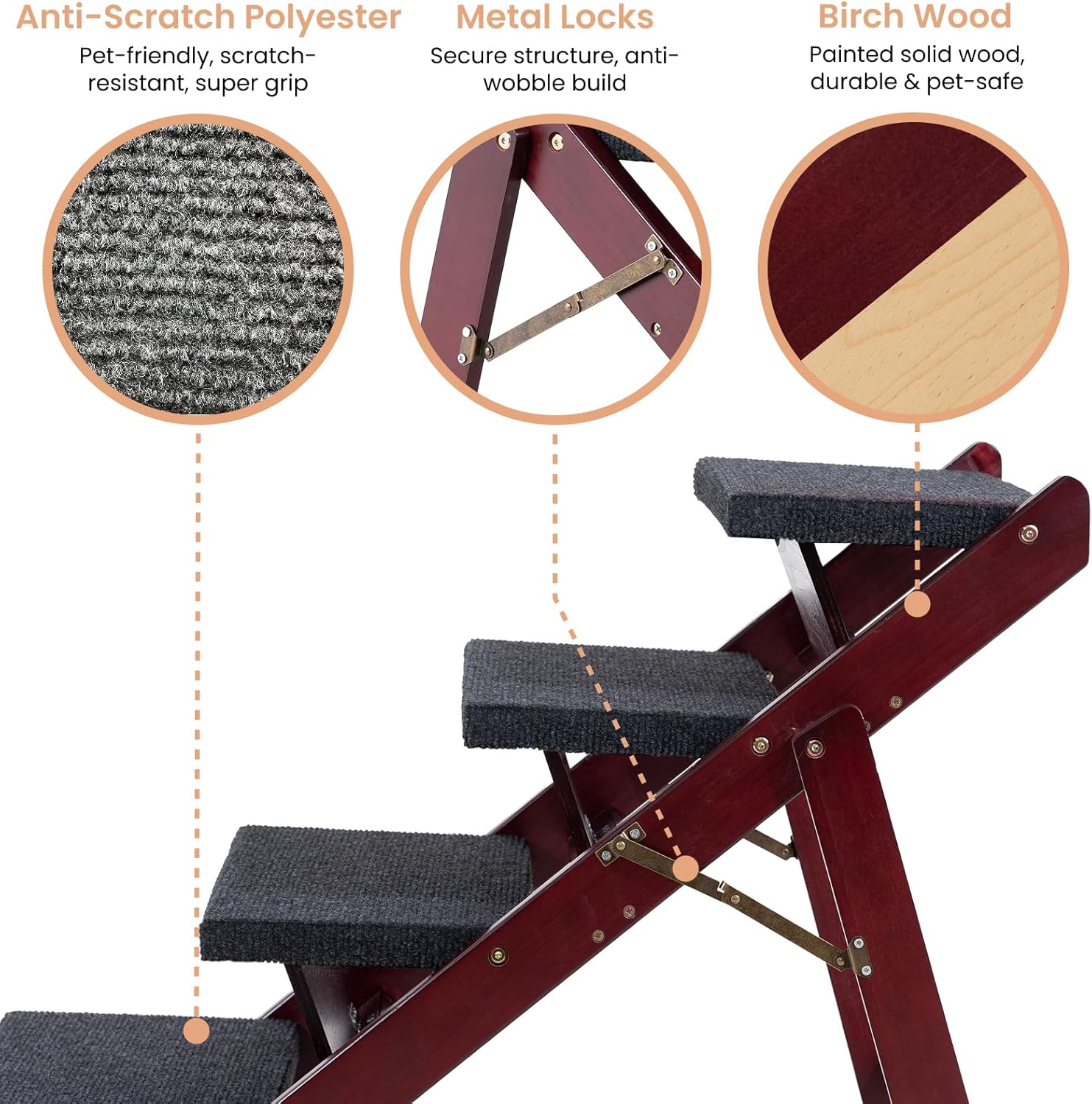 • 1. Adjustable 3-in-1 Ramp & Stairs Easily switch between stair and ramp mode to suit your pet’s needs. Whether for aging joints or tiny paws, our 3-in-1 foldable design (Stair / Ramp / Storage) ensures safe and comfy climbs.
