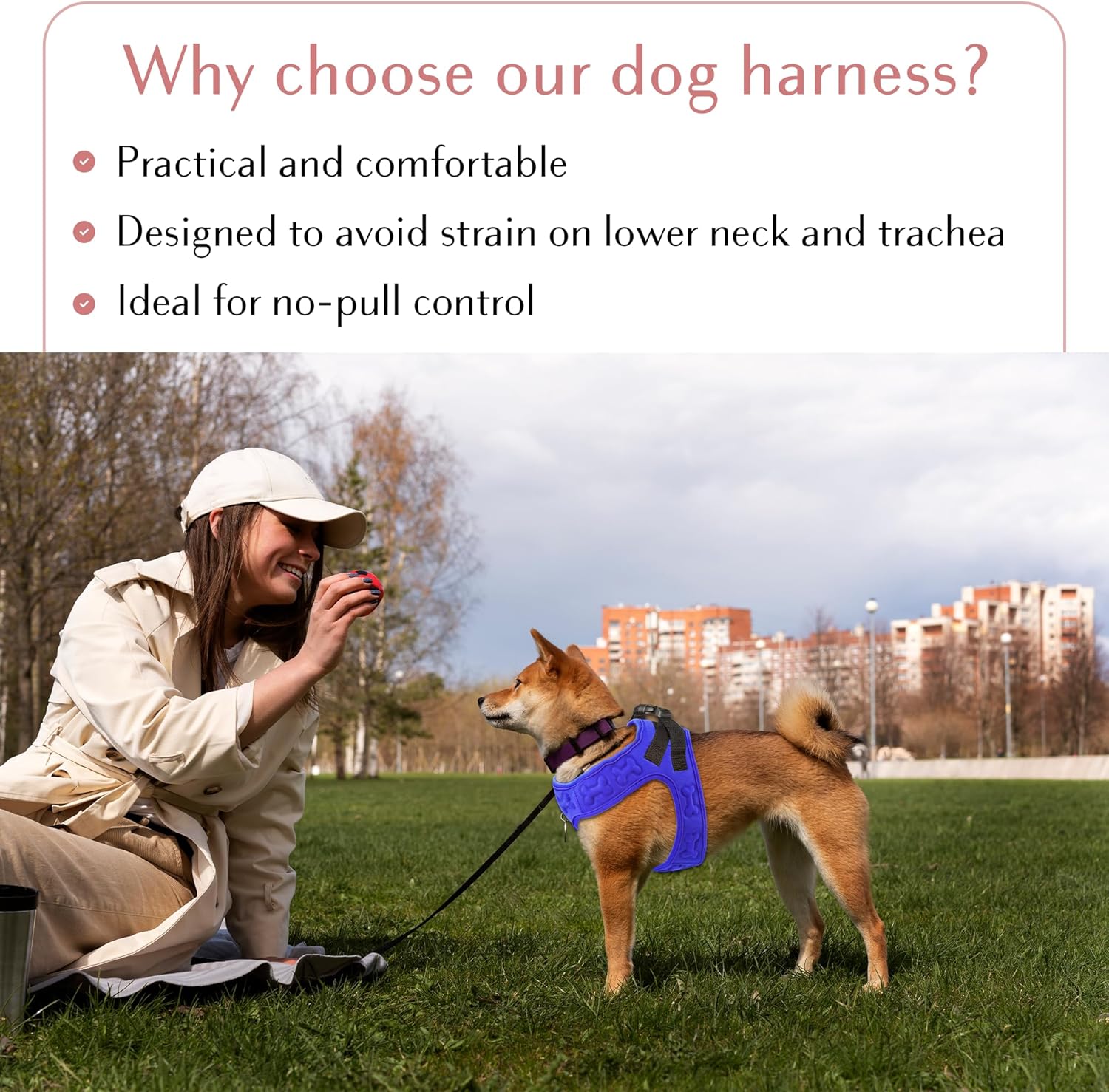 - 🌙 Breathable, Padded Comfort & Reflective Safety Crafted from soft, durable nylon oxford with breathable mesh lining and cushioned padding, this harness keeps your dog cool and comfortable all day long. Super-bright reflective strips enhance visibility and safety during nighttime or early morning walks.