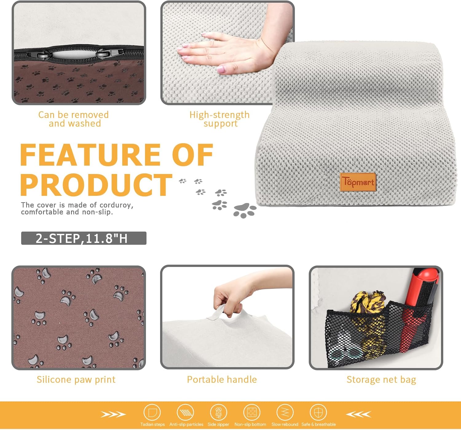 • Safer,Wider&Deeper Steps:Our dog stairs are excellent for those older dogs who are less mobile as they age or for cats with injuries. More wide and deep steps are helpful for reducing the strain that constantly jumping up and down onto lower bed,sofa can have on your pet's joints,and topmart dog steps will not shake and slip during use. The cover made of corduroy is more frictional than other covers, pets will not slip on the stairs.