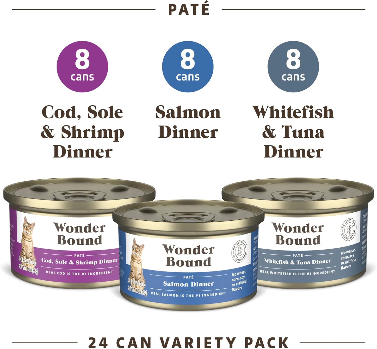 - 24 Pack of Wonder Bound Grain Free Cod, Sole & Shrimp, Salmon, White Fish & Tuna Patรฉ 3 oz cans, Variety Pack Wet Cat Food
