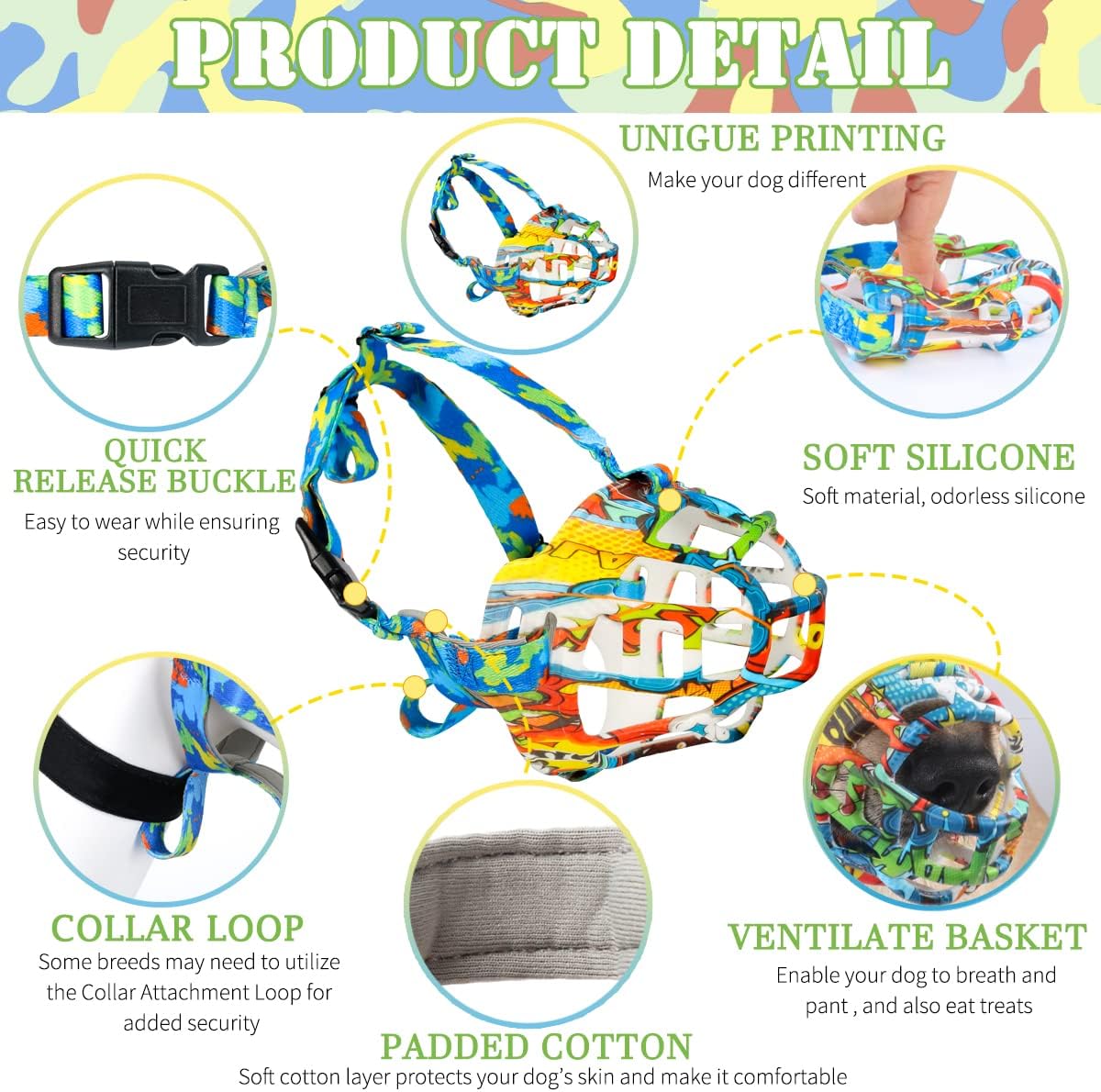 • Soft and Unique: Made of sturdy and safe silicone, it is comfortable for dogs skin and will not rub the dog's nose. There is a neoprene liner at the bottom to increase comfort. With unique printing technology, the appearance is different from the traditional basket dog muzzle, making your dog more attractive on the street