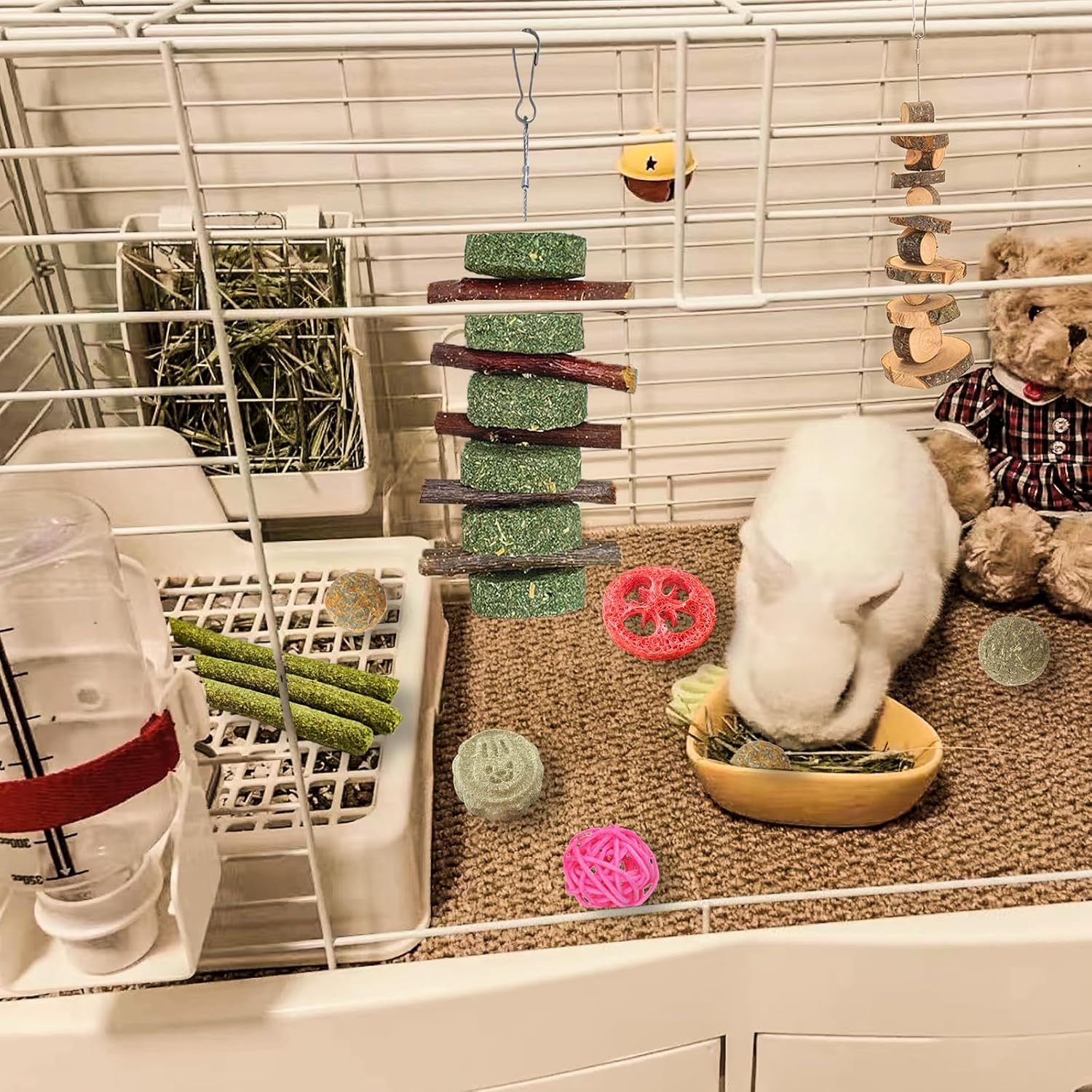 - 【20 PCS SET】1x apple wood molar string,1x timothy cake string,2x loofah toys,3x timothy grass ball with flowers, 1x rabbit shape grass cake,5x grass sticks,2x woven carrots,4x rattan balls