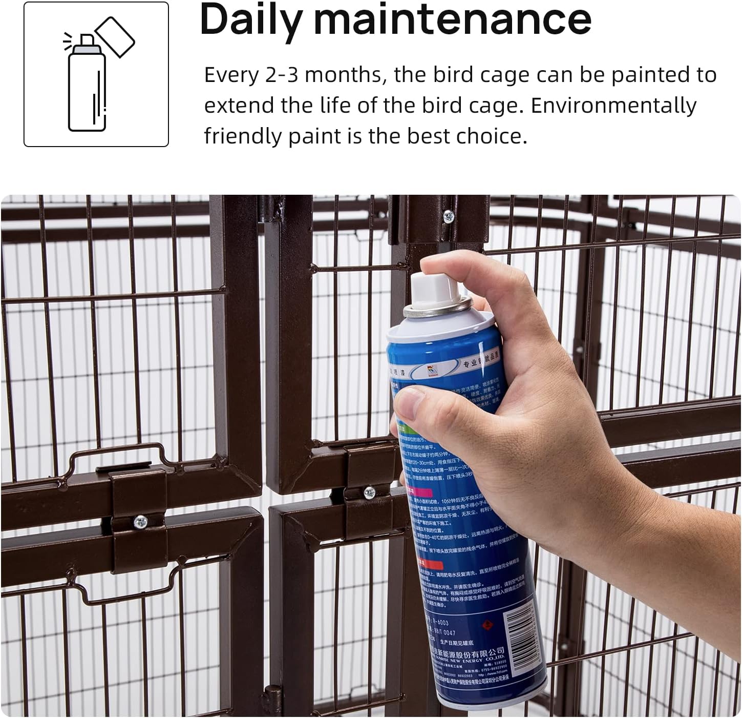 - Good Quality - Durable iron frame construction features excellent shock, rust, corrosion, tarnish resistance, which prolongs the service lifetime of the cage. Please do not expose the birdcage directly to rain. Otherwise it will rust easily. When it rains, please put on a birdcage cover or move indoors.
