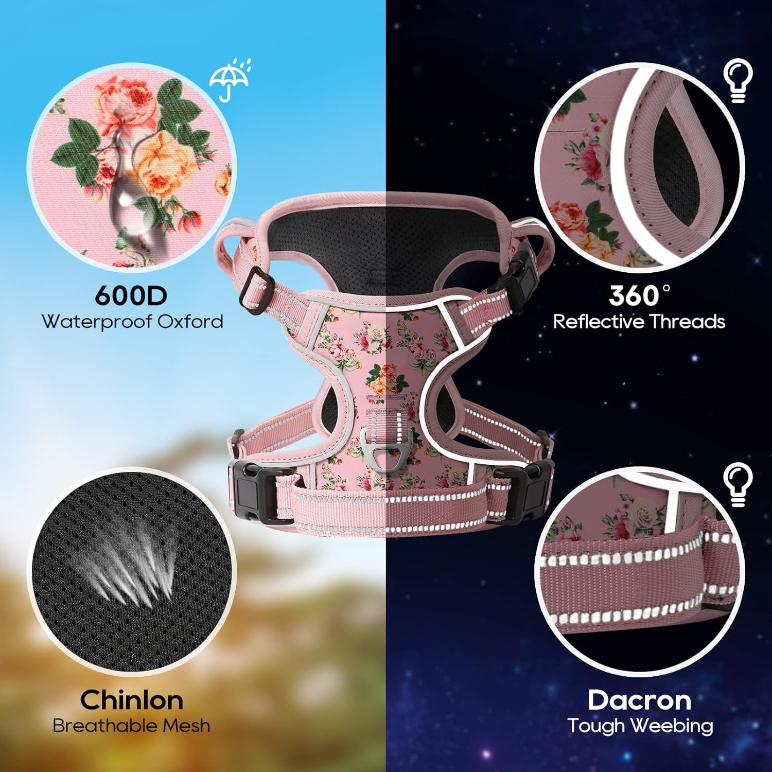 - 【MUCH SAFER & MORE COMFORTABLE】 Breathable mesh lining with soft sponge padding plate of puppy harness prevents injuries, giving extra comfort and protection with enhanced 1600D oxford fabric. The reflective material will be really nice when it gets dark. Also, your dog will be saw easily. This reflective material can make drivers have long time to react, which ensure your dog’s safety!