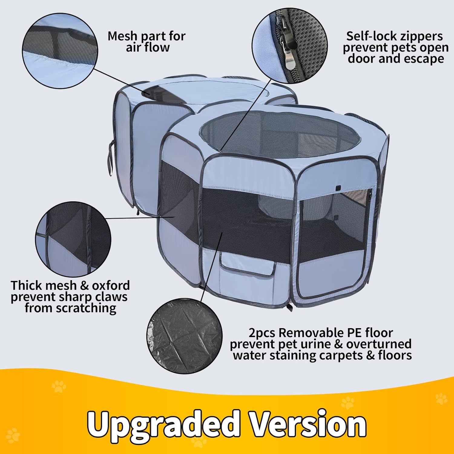 - 【Stable & Sturdy Construction】: Built with thicken metal frame, waterproof oxford cloth and reinforced stitching, ensuring long-lasting use, even with energetic pets. This playpen is designed to handle daily wear and tear while maintaining its shape.