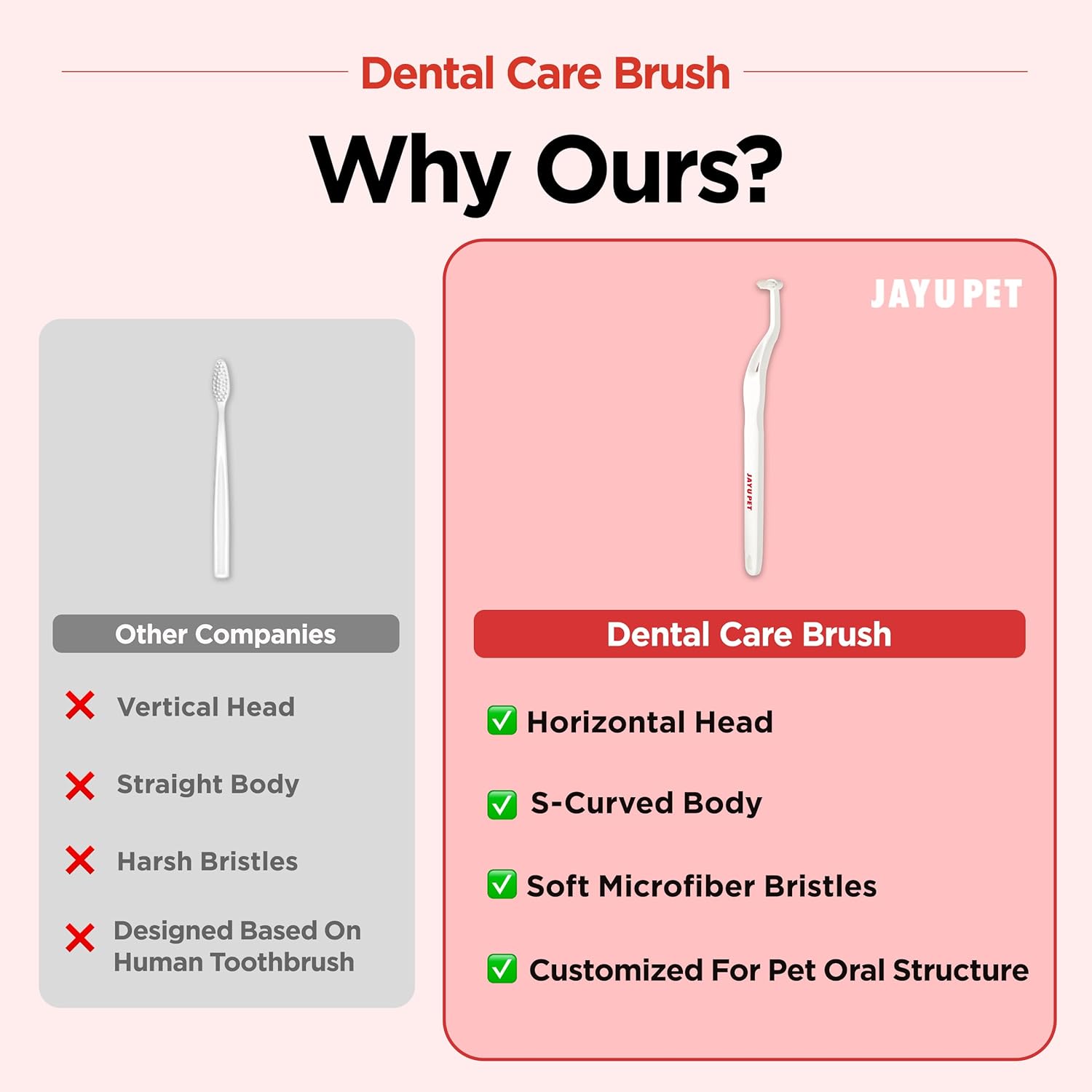 - Fun Toothbrushing Time - The toothbrush is customized dog toothbrush & cat toothbrush (horizontal head and S-curved body) based on the petβs oral structure. Therefore, pets tend to feel more comfortable while brushing their teeth.