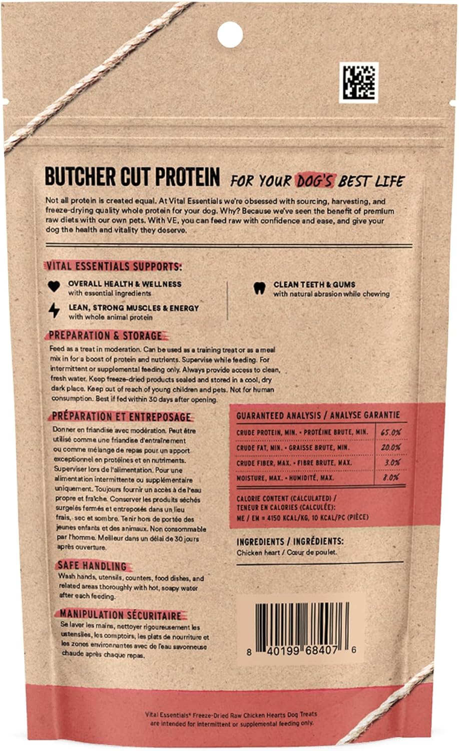 - FREEZE-DRIED RAW CHICKEN HEART DOG TREAT: Vital Essentials Freeze Dried Dog Treats pack more protein than industry standard into every bite to deliver the peak vitality your dog deserves. Our natural freeze-dried raw dog treats are made from responsibly sourced, premium butcher cut chicken hearts.