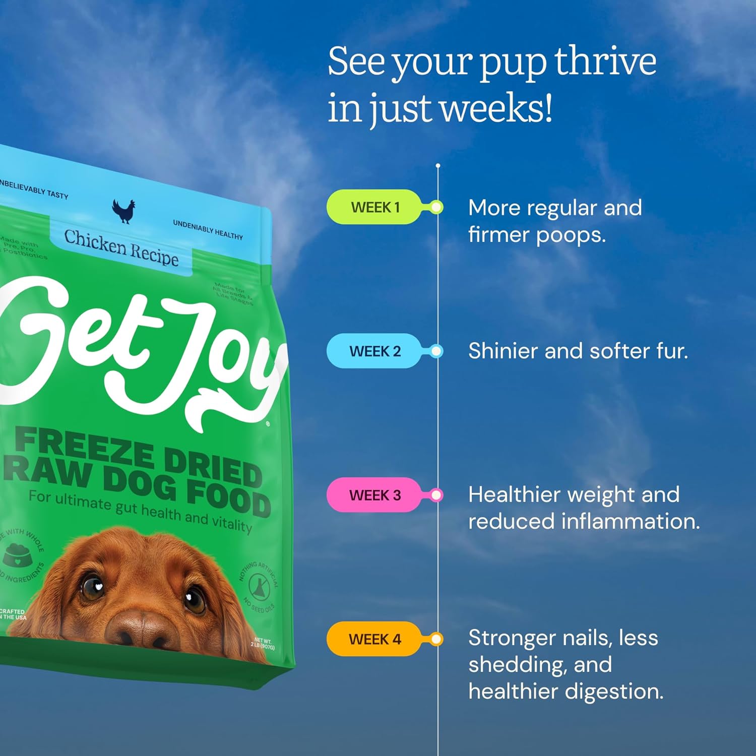 - Contains: (1) 16-Ounce Resealable Bag of Get Joy Gut Health Fresh Freeze Dried, Chicken Recipe. Our dog food is scoopable, pantry-friendly and ideal for owners who need nutrition with convenience - skip messy bowls, avoid freshness headaches, and free up freezer space