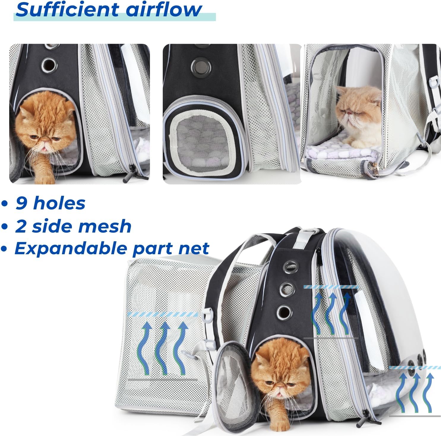 - Large expandable design: Measuring 13"L x 14"W x 16.5"H, Expandable part size is 13''L x 9.5''W x 13''H(square shaped)a larger cat backpack carrier in its class both in the backpack and the expanbable part; fits cats and medium dogs up to 16lbs; This backpack can be expanded in back and front panels; with more than twice the original capacity, this provides ample room to move around and reduces anxiety, creating a comfortable environment for your furry friend