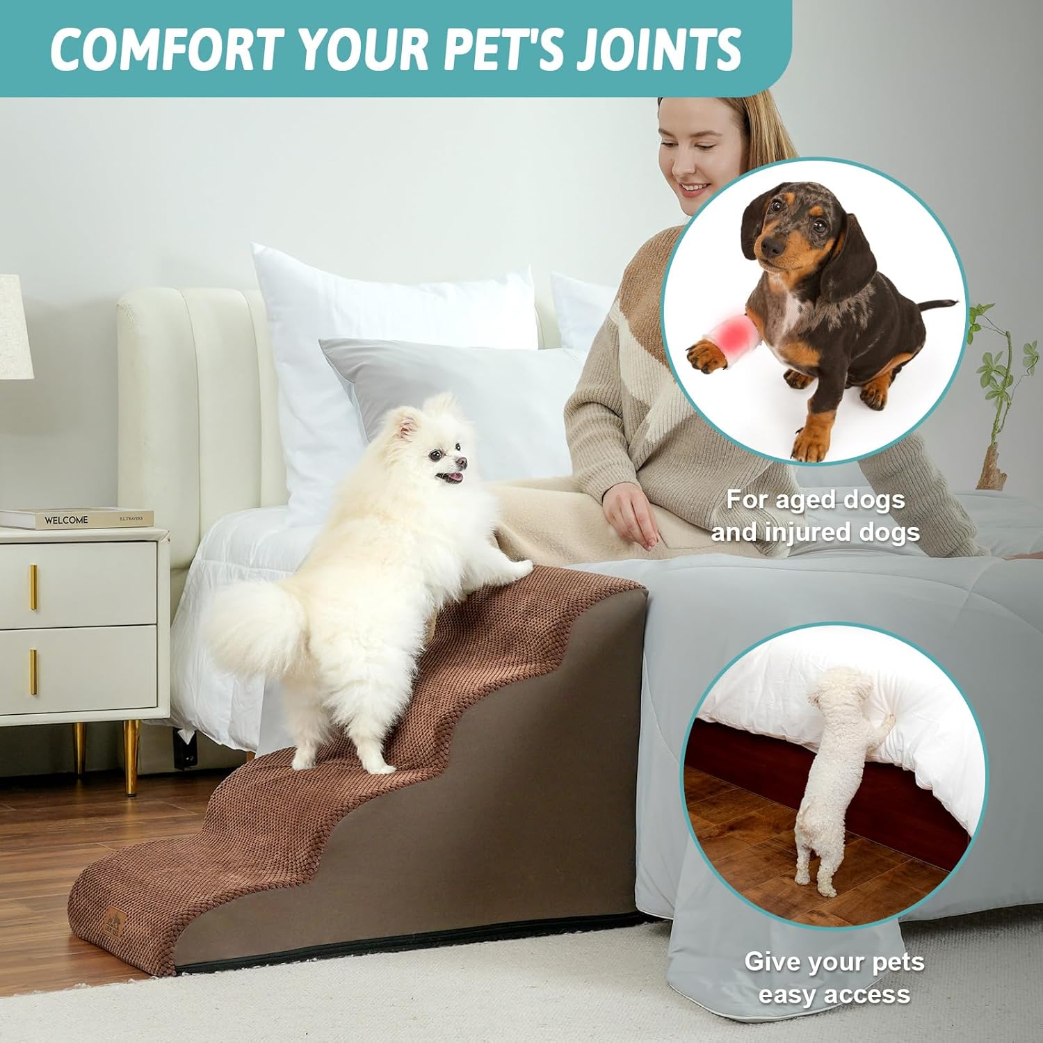 • HIGH DENSITY SPONGE: Foam dog stairs can support up to 80 pounds. Stairs for dogs to get on the bed adopt 30D high-density pure sponge, which provides better support, reducing the pressure on the joints when pets repeatedly jump on high bed, sofa, couch and car. The stairs are covered with high-quality corduroy to provide additional stability