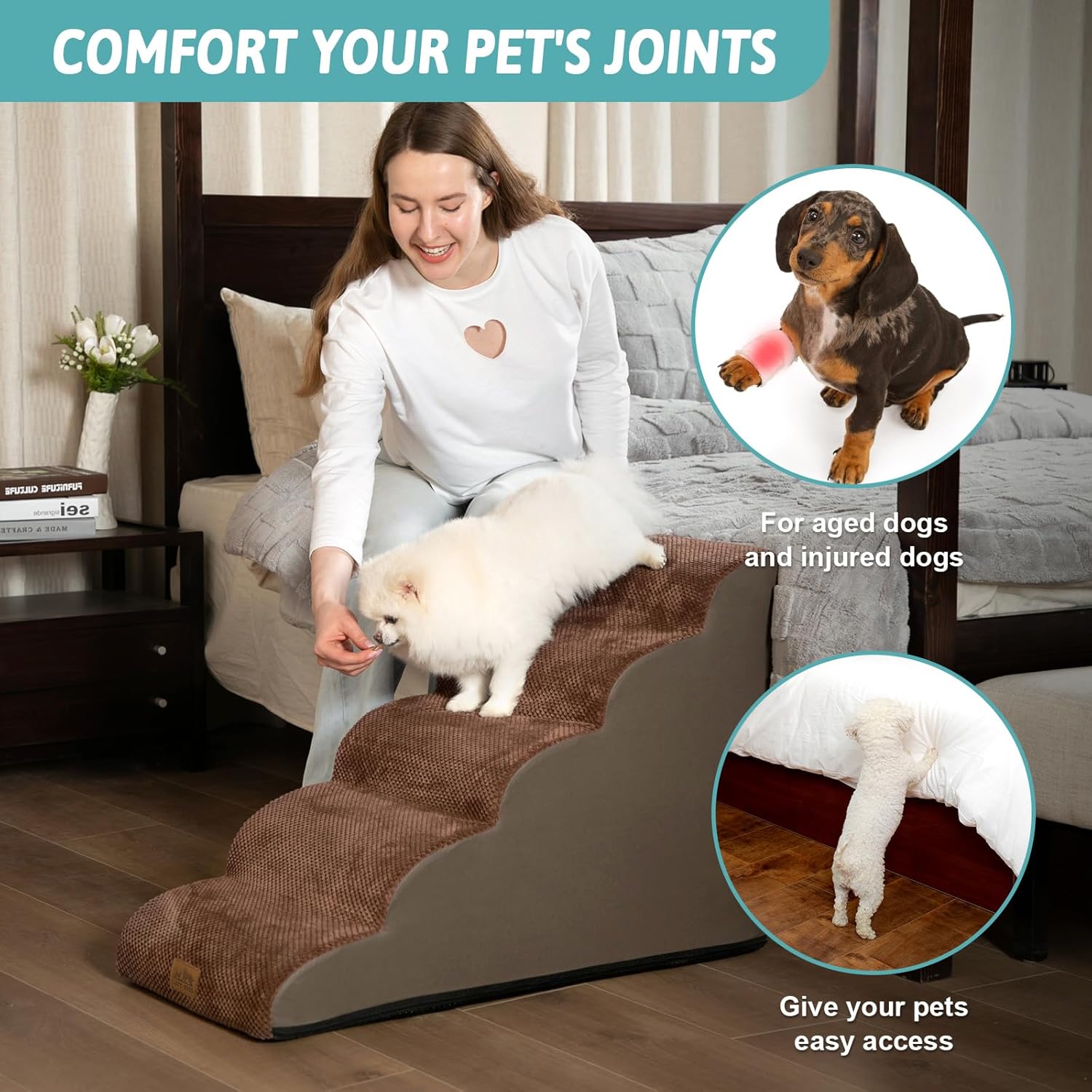- HIGH DENSITY SPONGE: Foam dog stairs can support up to 80 pounds. Stairs for dogs to get on the bed adopt 30D high-density pure sponge, which provides better support, reducing the pressure on the joints when pets repeatedly jump on high bed, sofa, couch and car. The stairs are covered with high-quality corduroy to provide additional stability