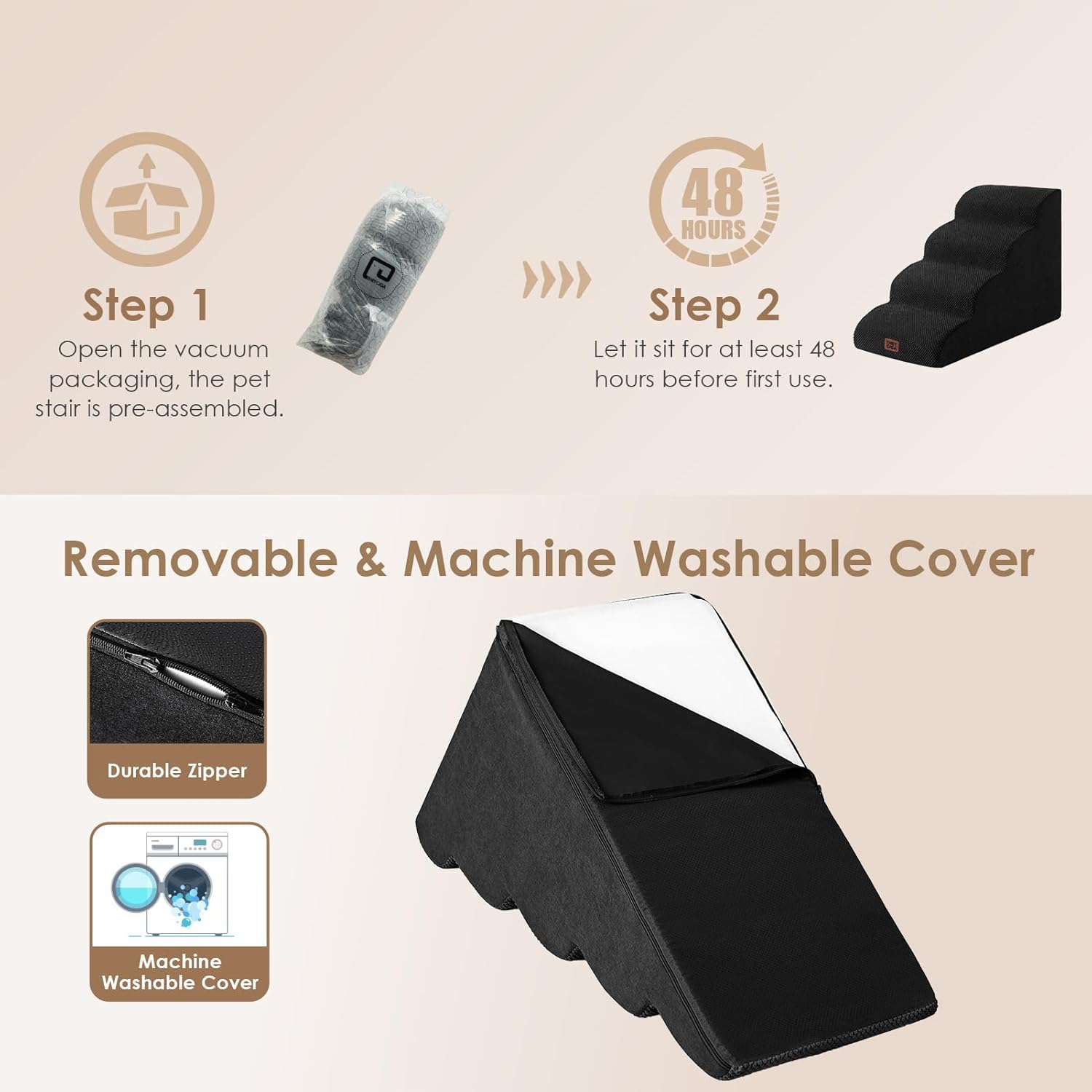 - COMFORTABLE PET STAIRS - This foam dog stair is designed directly against the edge of a bed, sofa or other furniture, so your pet can climb up and down comfortably.