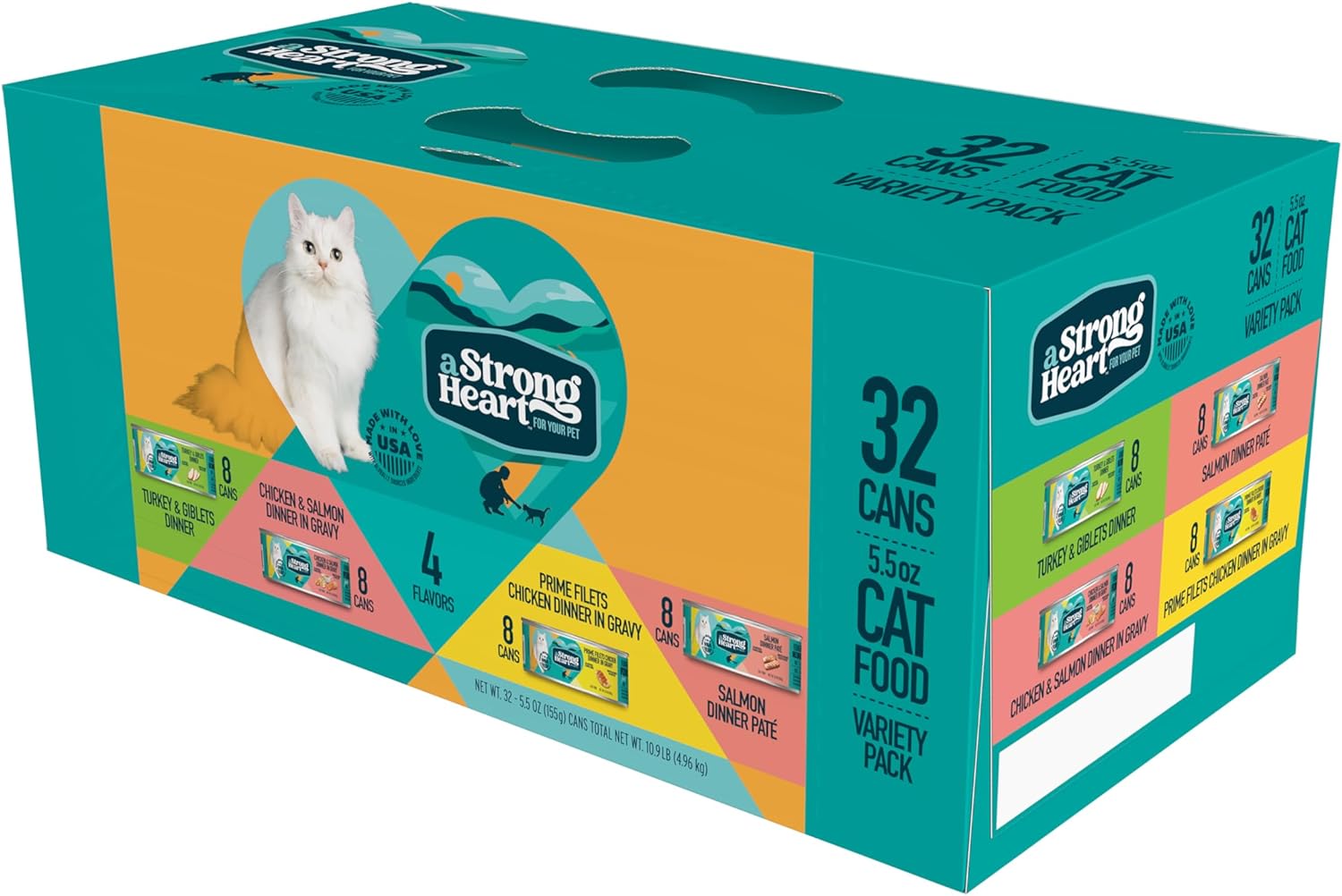 A Strong Heart Canned Wet Cat Food, Dinner Variety Pack - 5.5 oz Cans (Pack of 32), Made in The USA with Real Chicken, Turkey & Salmon