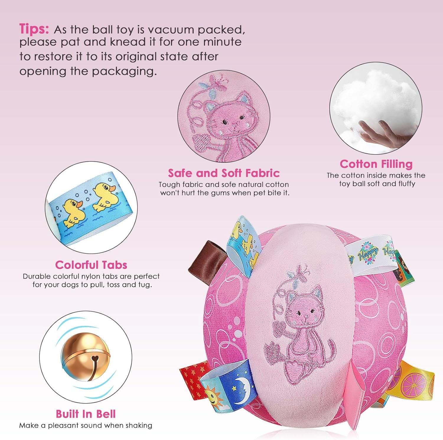 • Interactive Squeaker Toy: Each stuffed dog ball toy is equipped with a built-in bell that produces a pleasant sound when shaked, enticing dogs to engage and play. Each ball has 15 colored tags on it, making it easy for you to interact with your dog.