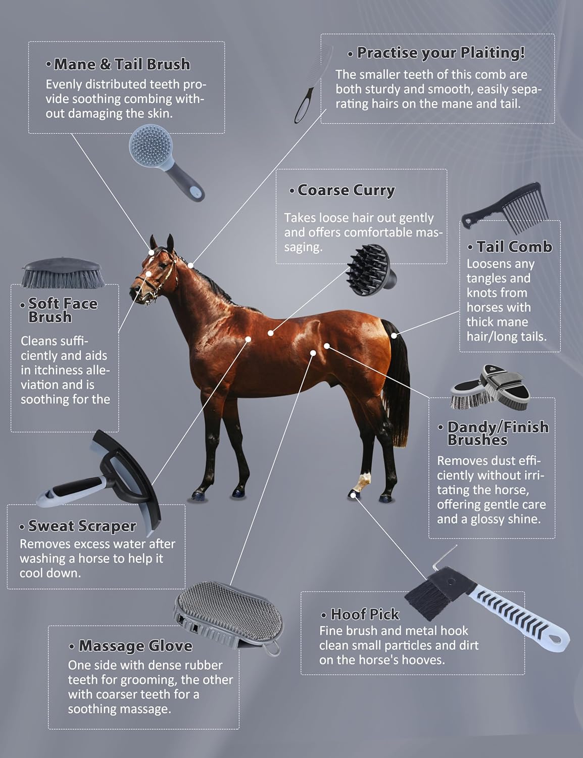 - Durable & Long-Lasting: Made from high-quality materials, the brush set features premium plastic construction with special wear-resistant treatment, ensuring exceptional durability that far surpasses ordinary brushes. These horse brushes effectively remove dirt from the horseβs coat, stimulate blood circulation, and promote natural oil production for a smooth, glossy coat.