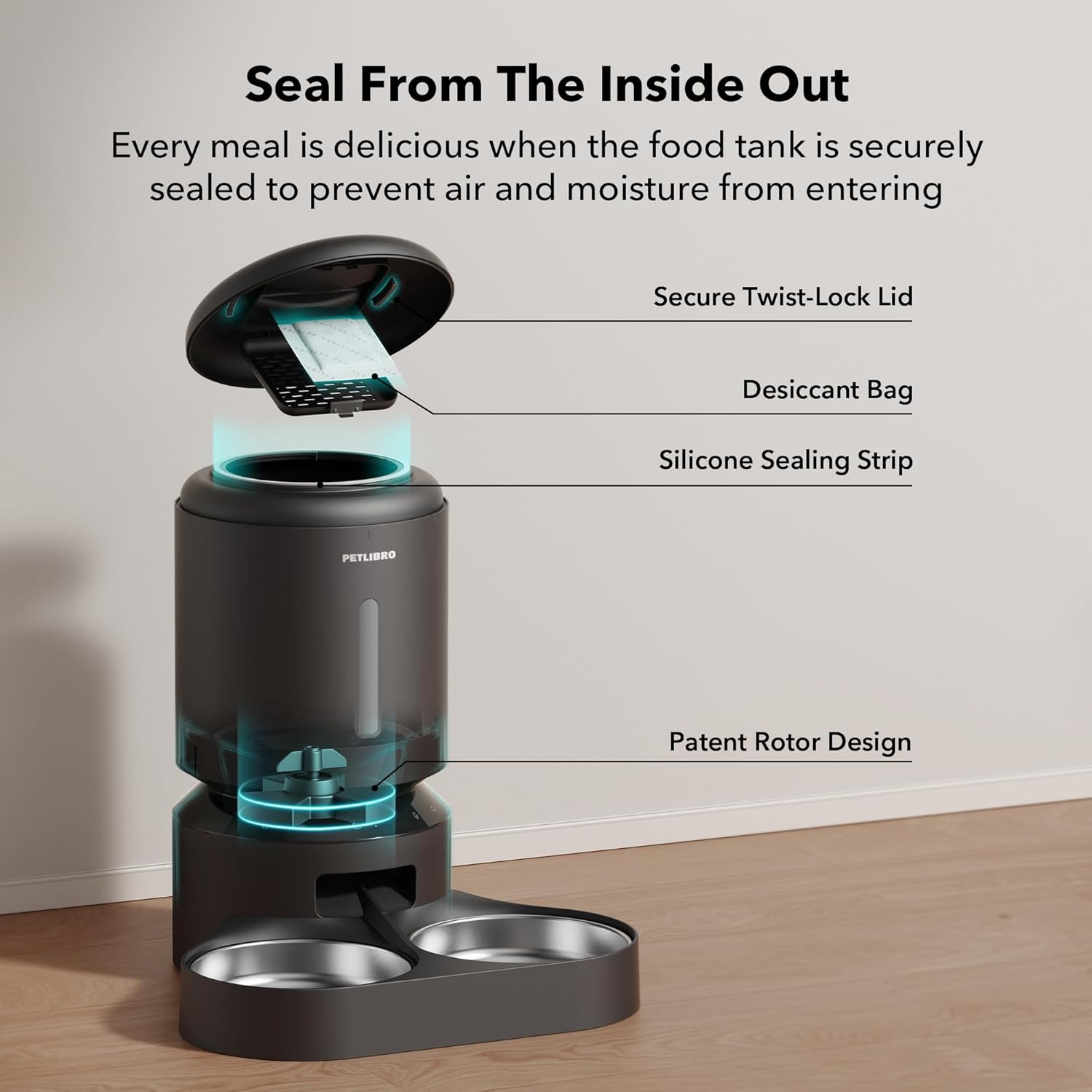 • MULTIPLE FRESHNESS PRESERVATION: the PETLIBRO automatic pet feeder has a built-in desiccanat and sealing strip to keep food fresh. Food grade stainless steel bowl, healthy and hygienic, easy to clean. Patented rotor and twist-lock lid design effectively prevents pets from stealing food.