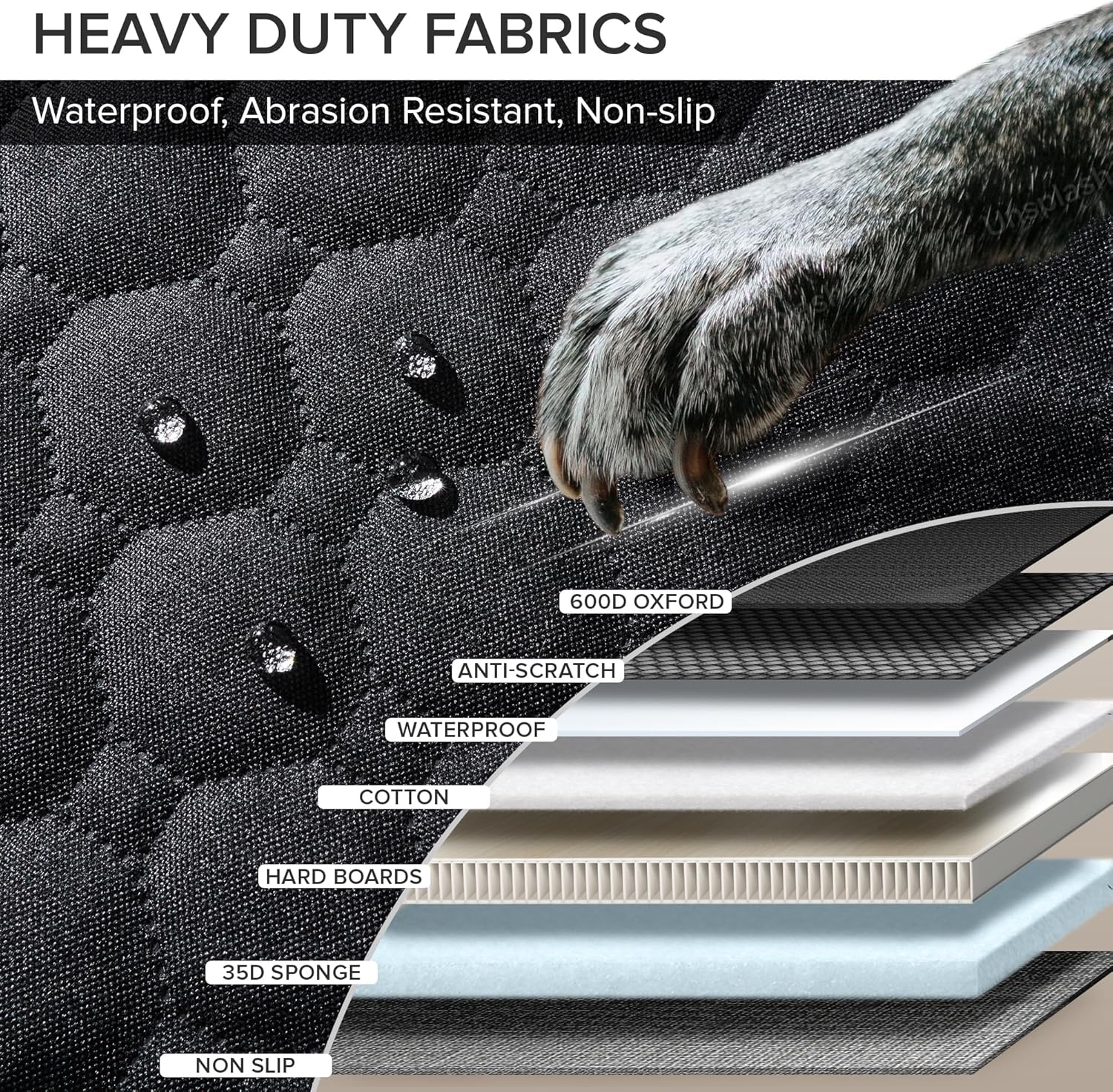 - 7-LAYERED CONSTRUCTION FOR SUPERIOR SUPPORT AND COMFORT - Crafted from durable materials 600D scratch-resistant Oxford cloth, waterproof fabric, reinforced hard bottom boards, 35D soft sponge, and cotton layers, this truck seat cover for dogs offers comfort and a non-slip surface. It shields your truck from damage, with an extra-high door flap to prevent scratches, allowing dogs to enter and exit without hassle