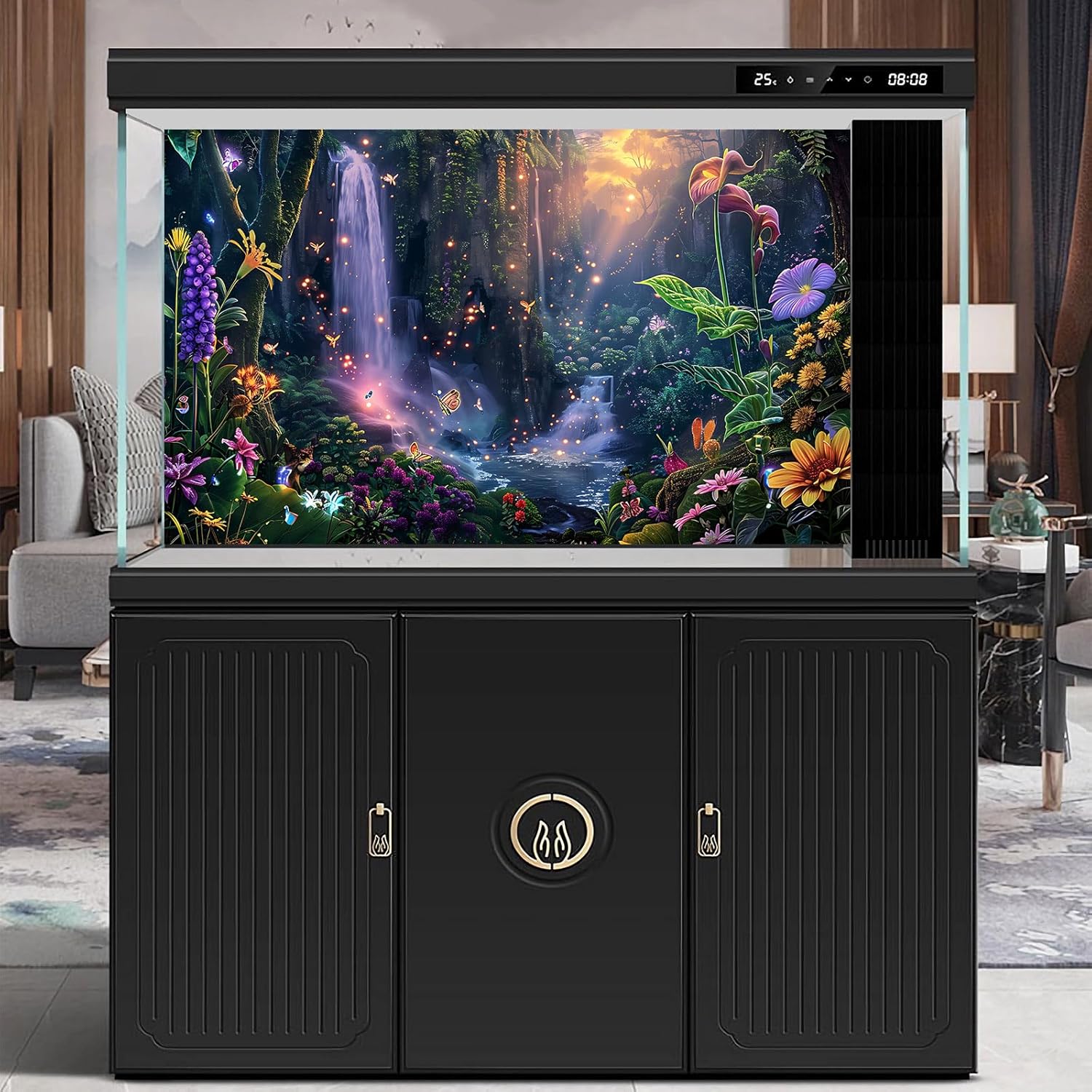 Fantasy Garden Aquarium Background Sunset Waterfall and Flowers Terrarium Backdrop Tropical Forest Lush Plant Magic Butterfly Lights Flowers Fish Tank Background Poster Decorations 48x18in