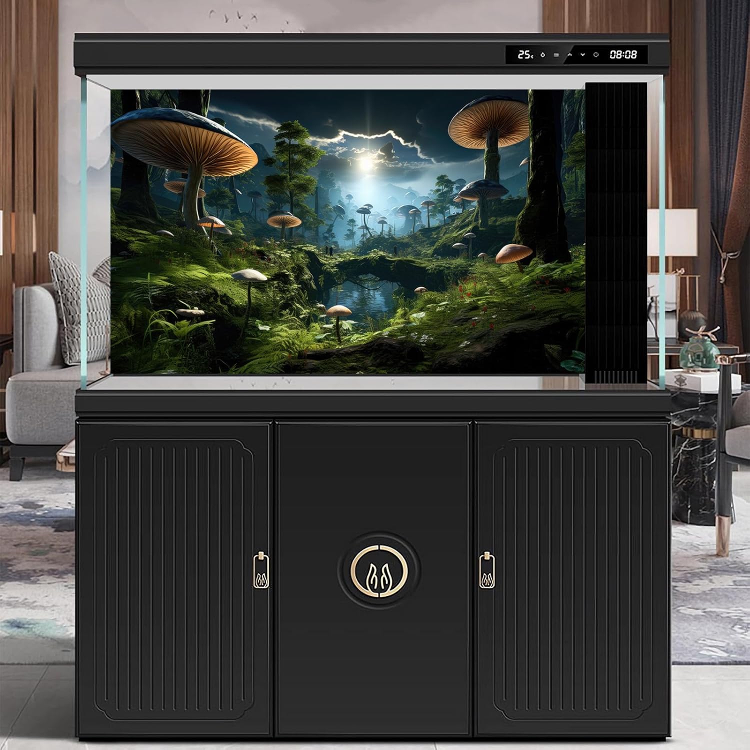 Fantasy Mushrooms Landscape Aquarium Background Tranquil Stream Cloudy Sky Terrarium Background Lush Green Tropical Plants Trees Fish Tank Backdrop Decoration Tank Background Poster 48x20in