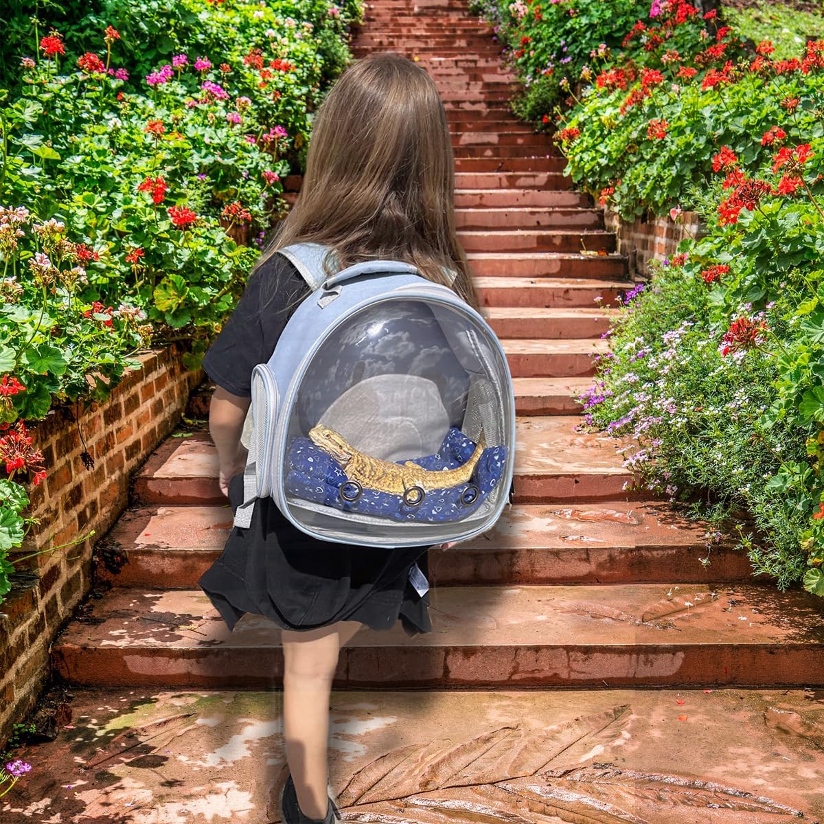 - Bearded dragon backpack carrier with leash and harness set has a big bubble Window. The front hard clear bubble window is better to protect reptile from crushing and attacking if accidents, it also provides a nice front view so they could check surroundings without anxiety.