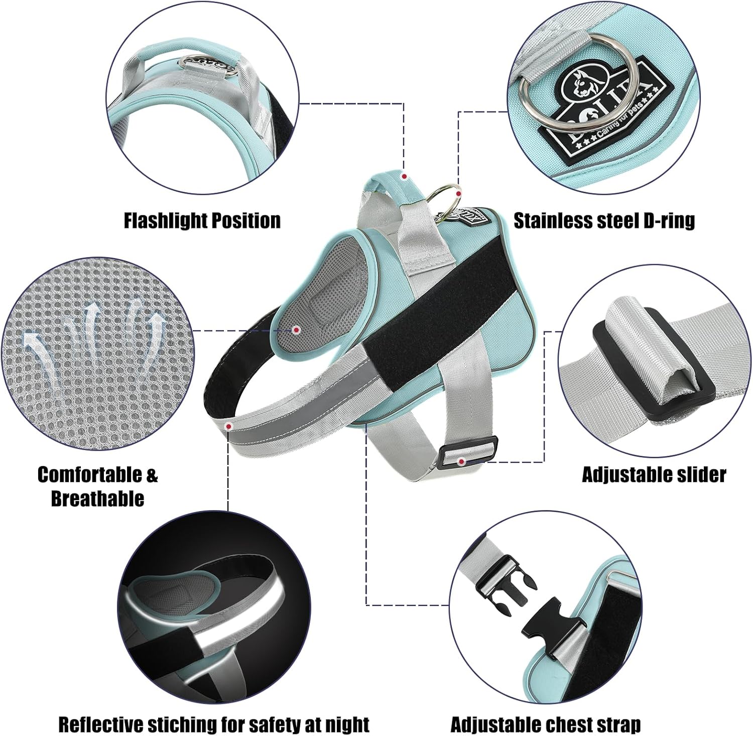 - STURDY HANDLE: The adjustable dog harness with rugged nylon handle further enhances your distance from the dog and is more intimate with each other. Easy on dog harness is also the best partner for dogs and is easy to control your dog.