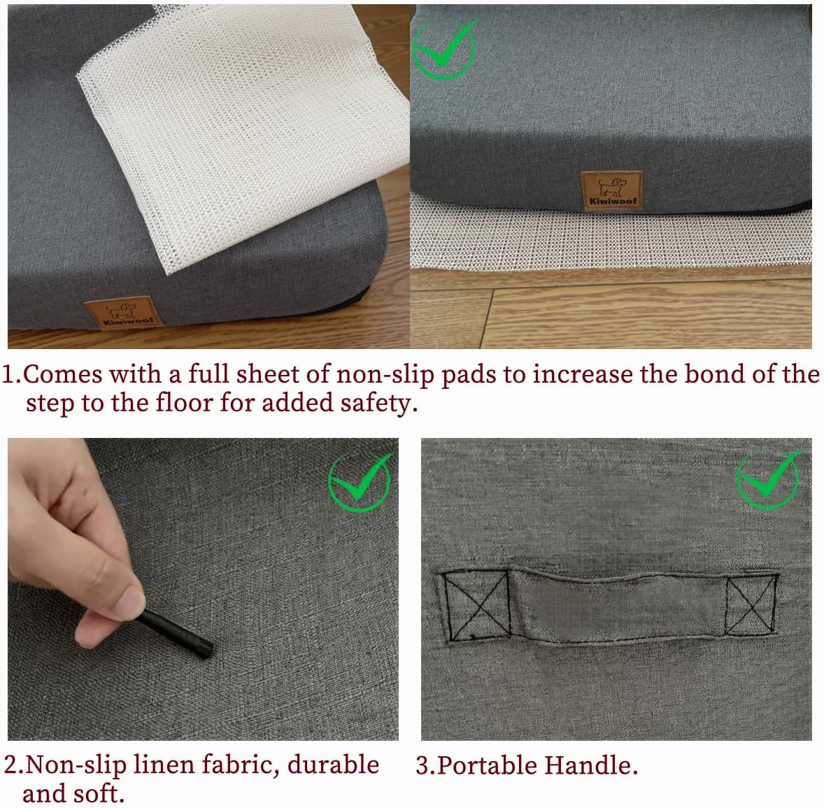 - 3.Stable and non-slip: The surface layer of the dog ladder is made of thick linen. The fabric is non-slip and waterproof, providing a soft and non-slip experience for the pet's feet. In addition, we also provide an extra non-slip mat that can be placed under the dog staircase to make the staircase more firmly fixed to the floor or carpet. In addition, the fabric cover is removable and washable, which is very convenient.