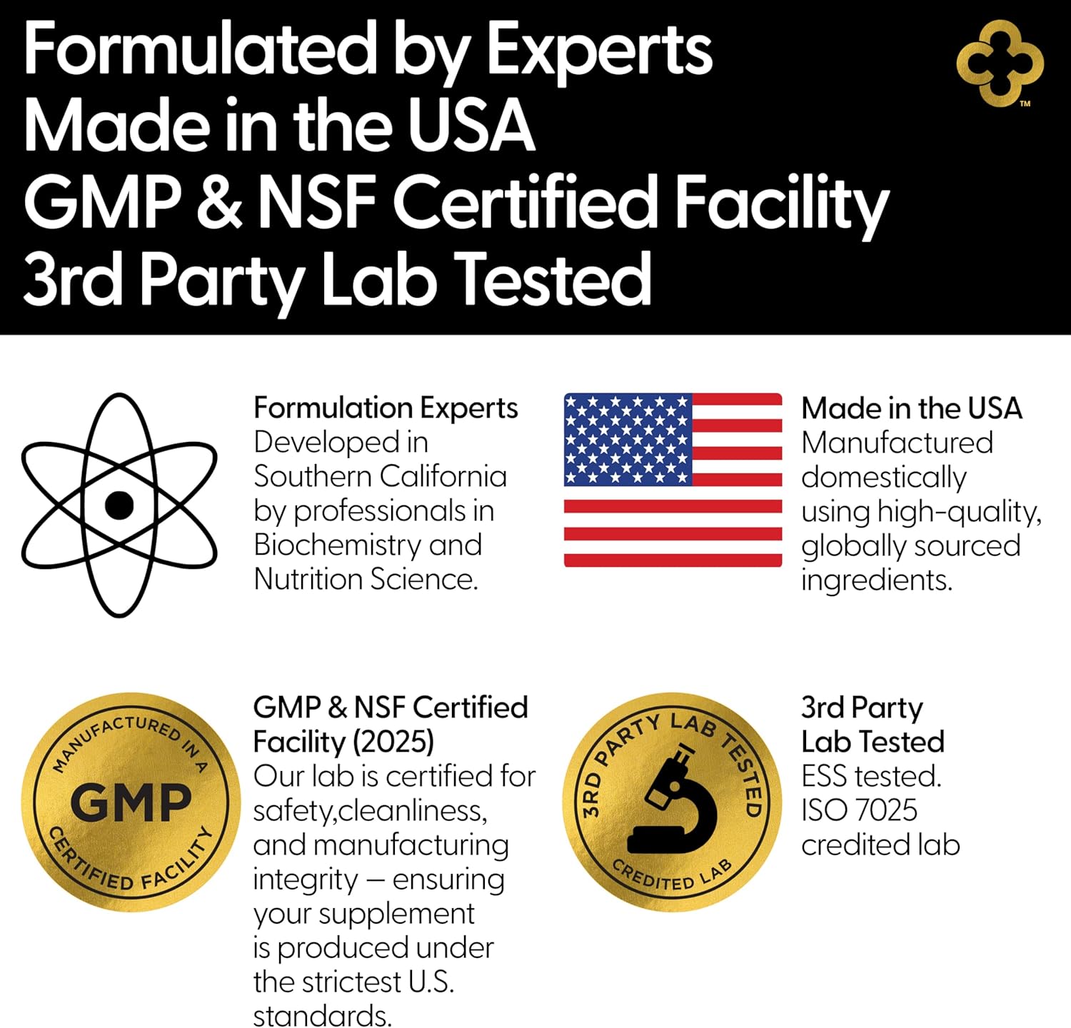 • PREMIUM QUALITY, MADE IN USA: Produced in a cGMP-certified facility, our supplement is free from sugar, artificial flavors, sweeteners, tree nuts, synthetic dyes, titanium dioxide, dairy, and egg ingredients.