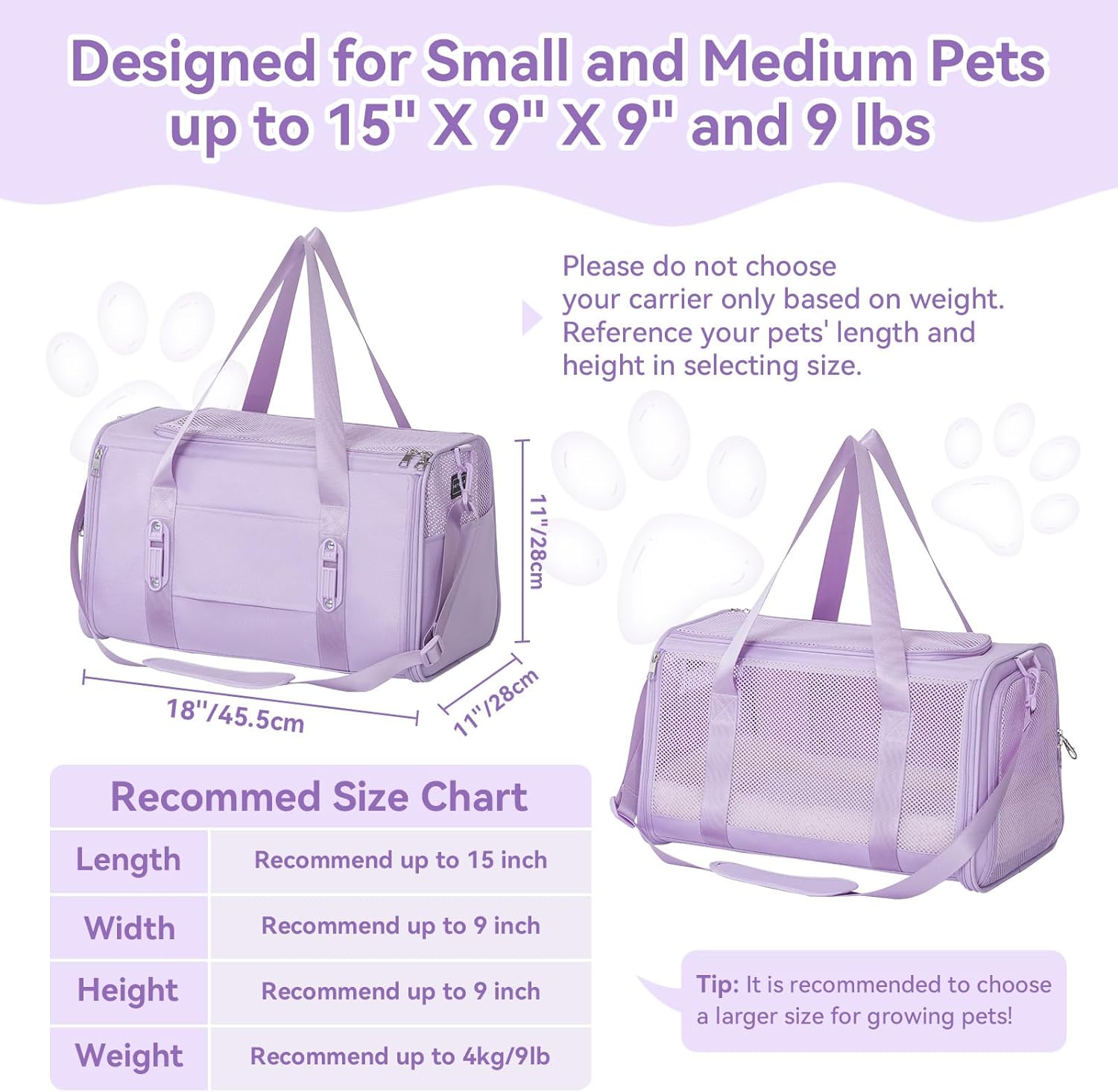 PETSFIT Soft-Sided Cat Carriers & Car Seats with Patent Safe Buckles, Clip-On Harness, 18"x11"x11" Airline Approved Pet Carrier - 9 lbs Capacity (Purple)