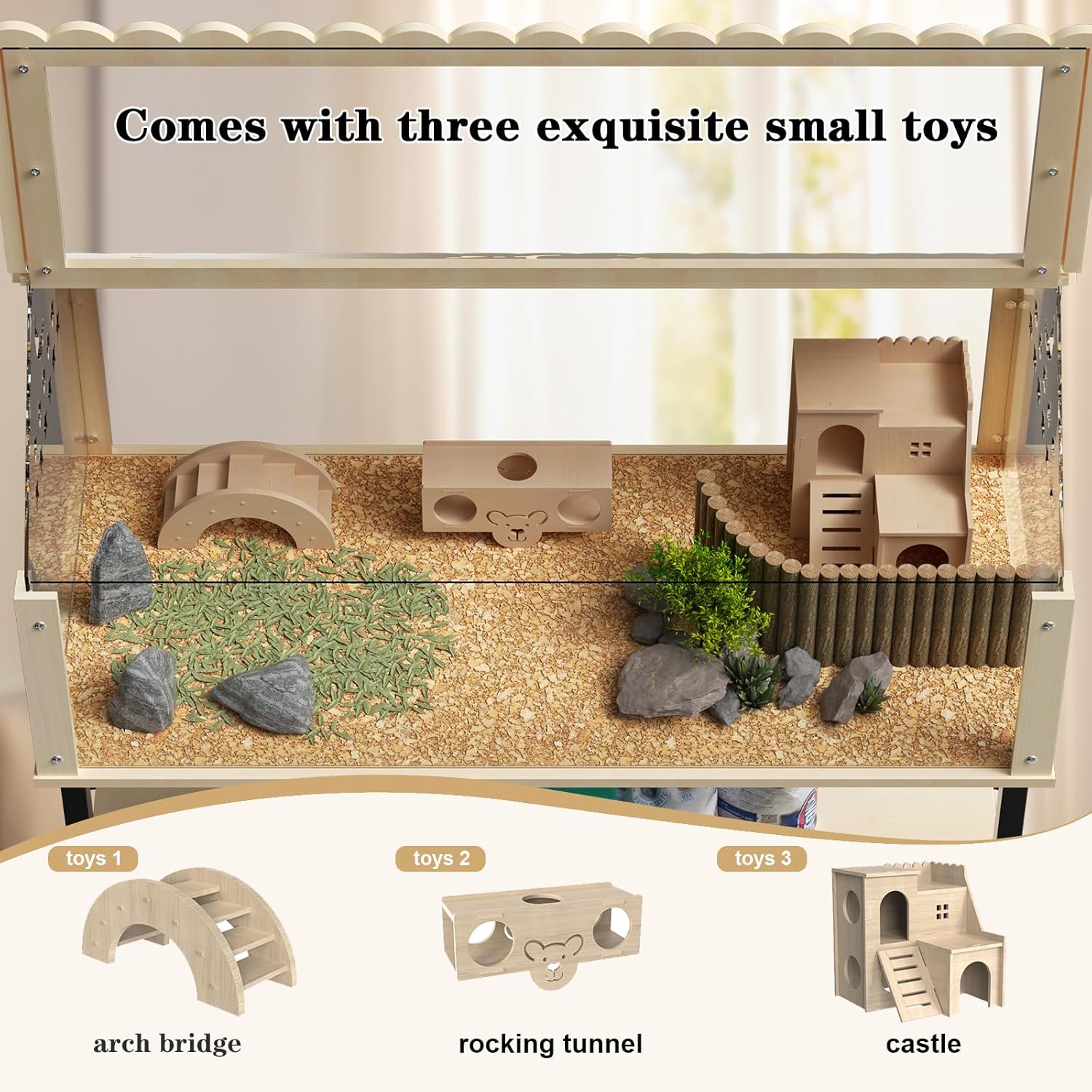 • 💕【Good Ventilation】: The cage is made of wood frame and clear acrylic panels, providing a durable and lightweight structure. The four sides are wrapped with wooden strips to prevent hamsters from chewing on the cage and protect their teeth.