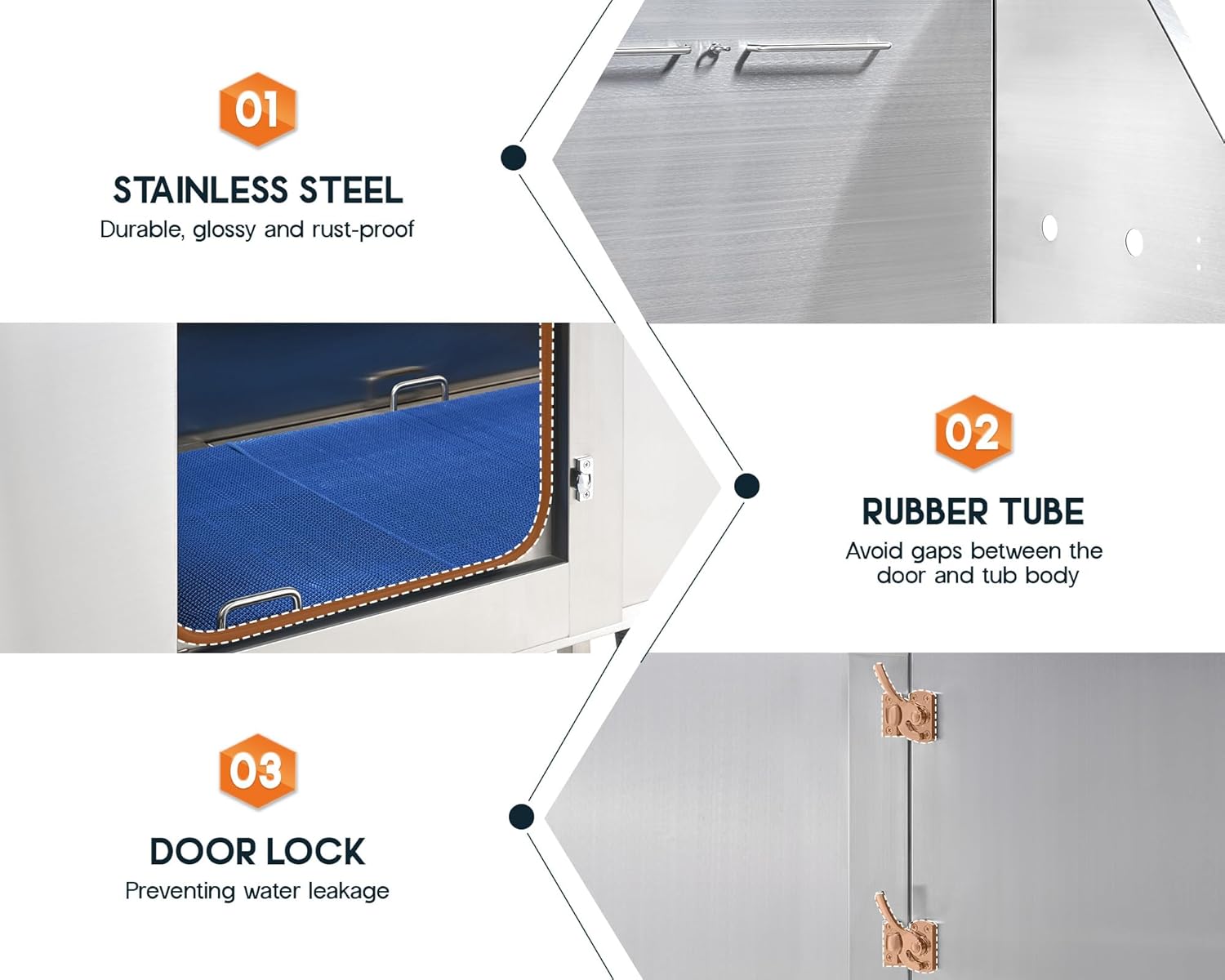 - Leak-proof Design: 50-inch dog wash station, suitable for various pet sizes. Innovative seamless welding, rubber tube and door locks ensure no leaks or pets running out during use.