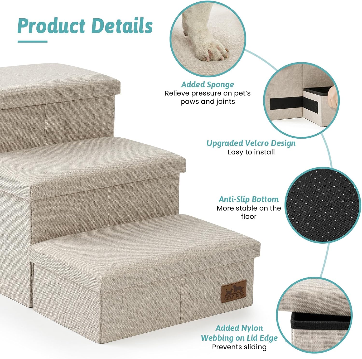Dog Stairs with Storage, 4-Step Wider Sturdy Dog Steps for Small/Medium/Large Dogs and Older Cats, Folding Doggie Ramp for Bed/Couch/Car Hold Up to 180 lbs (22" H, Beige)