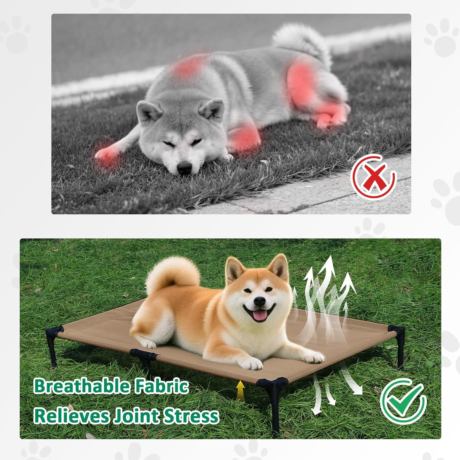 • BREATHABLE TESLIN MESH: This outdoor dog bed comes with breathable and durable Teslin mesh, provides airflow and firm support to relieve joint pressure. Our dog cot bed is suitable for dogs of all life stages, from puppy to the senior