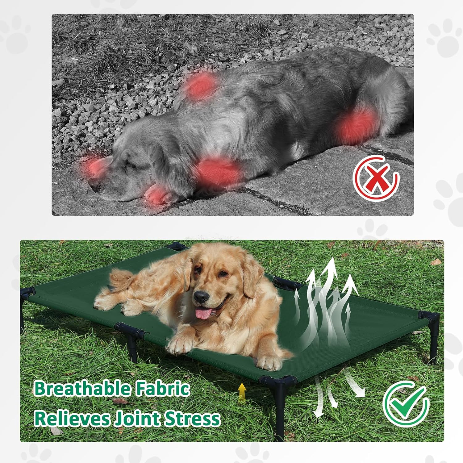 - BREATHABLE TESLIN MESH: This outdoor dog bed comes with breathable and durable Teslin mesh, provides airflow and firm support to relieve joint pressure. Our dog cot bed is suitable for dogs of all life stages, from puppy to the senior
