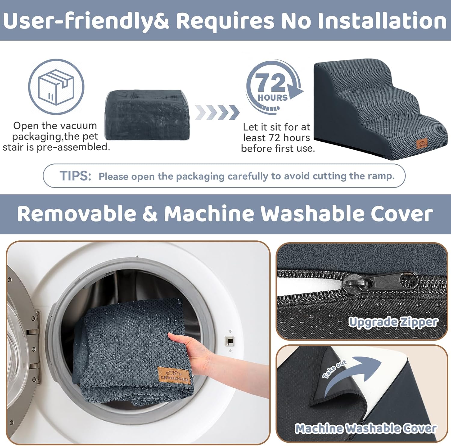 - No Assembly Required & Easy to Clean: When you open the packaging, the pet stair is already assembled. Before the first use, it should be left standing for at least 48-72 hours for the foam to fully expand. NOTE!! Open the packaging carefully to avoid cutting the stair! The outer cover can be removed for cleaning and supports machine washing or hand washing. Please note that the inner foam is not washable.