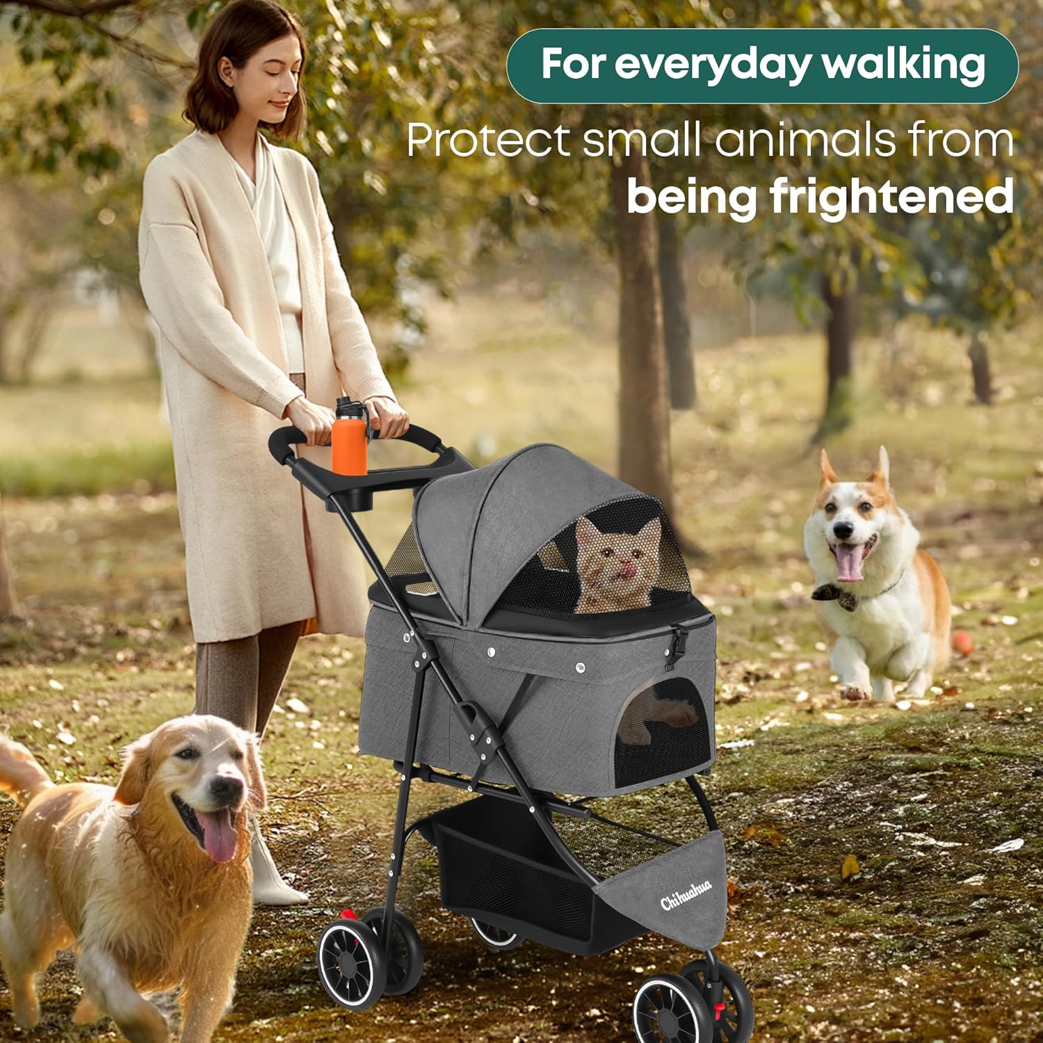 - [All-Terrain Safety & Control] The cat stroller equipped with 360° swivel front wheels for smooth maneuverability and dual rear brakes for instant stopping power. It glide seamlessly on sidewalks, grass, or uneven terrain, ensuring a safe ride