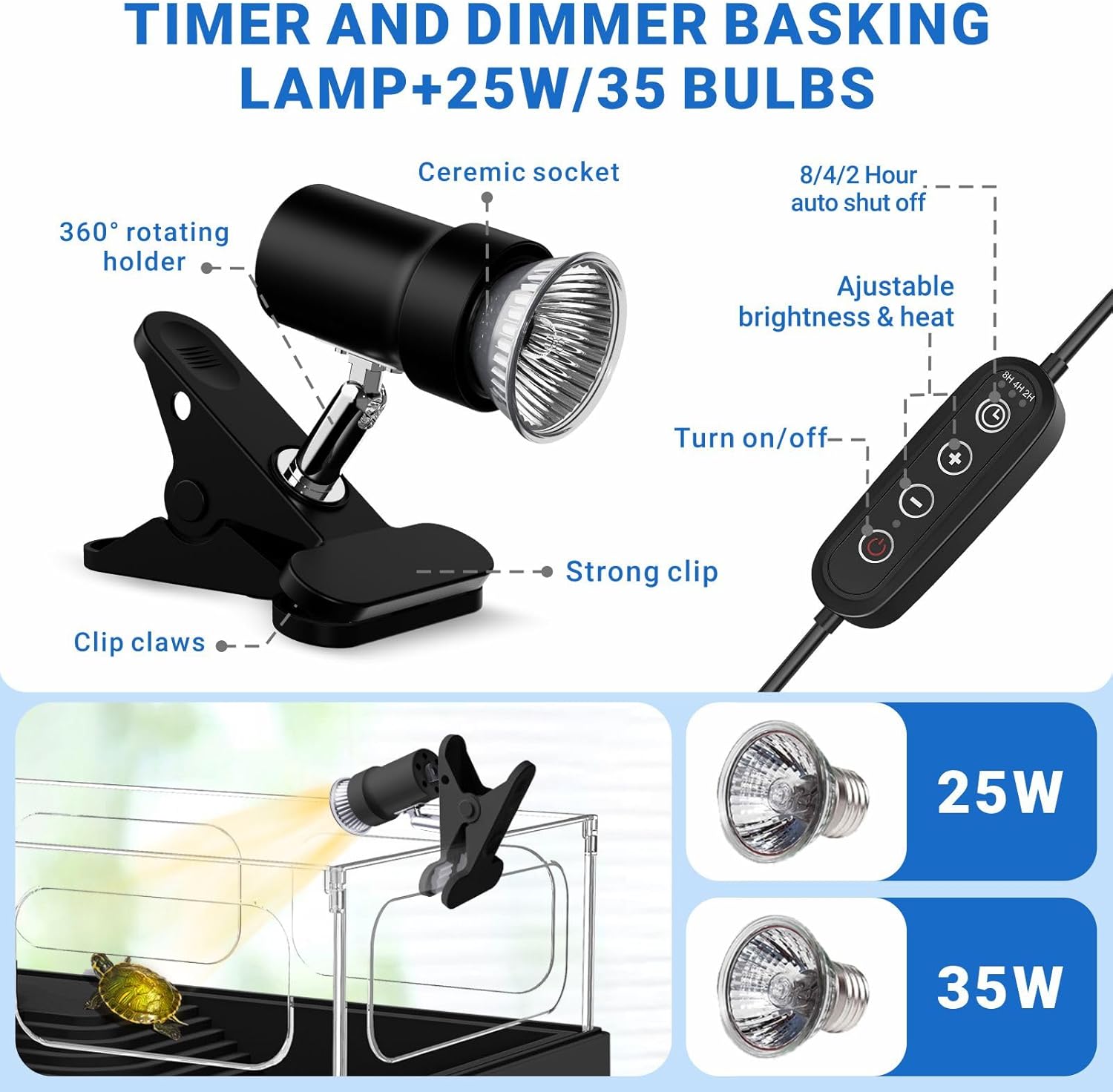 • 【ADJUSTABLE UVA/UVB BASKING LAMP + 25W/35W BULBS】Turtles need 1-2 hours of sunlight per day for metabolism, mood regulation, reproduction, etc. Sunlight simulation lamp provide optimal warmth at a distance of 10" to 15". In addition to controlling the brightness, basking lamp can also be set for 2, 4 or 8 hour with auto shut-off function. Making cozy sunbath for your reptile friends.(Note:The rated voltage power is applicable to 110V-130V)