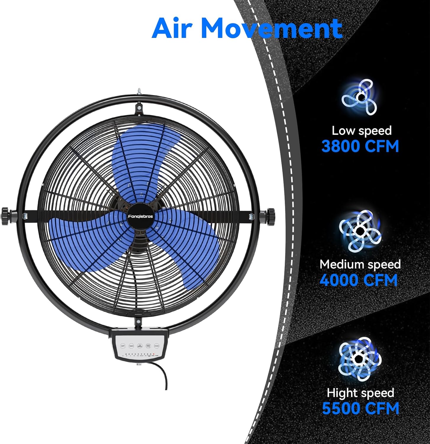 • ๐‡๐ข๐ ๐ก ๐•๐ž๐ฅ๐จ๐œ๐ข๐ญ๐ฒ ๐€๐ข๐ซ ๐…๐ฅ๐จ๐ฐ - The heavy duty wall fan design makes the operation more intuitive and simple, and the high, medium and low speeds can be adjusted by the remote control to meet different needs. High speed 5500 CFM, medium speed 4000 CFM, low speed 3800 CFM, providing hurricane-like airflow to meet your garages, shops or outdoor use๏ผˆNote: used on a covered patios or porch, BUT NOT EXPOSED TO RAIN๏ผ‰