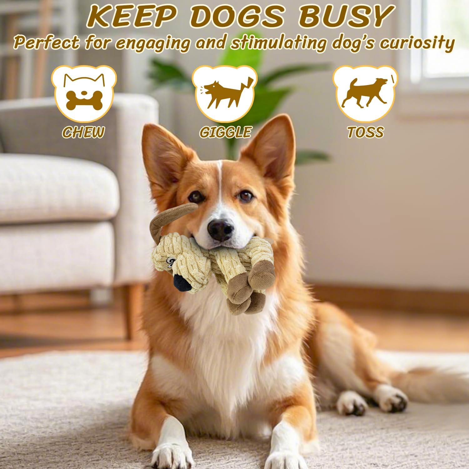 Squeaky Stuffed Dog Toys, Chew Toy for Large Medium Small Breeds, Plush Dog Toys to Keep Them Busy, Puppy Teething Dog Toy, Crinkle Dog Toy (Khaki Dog)