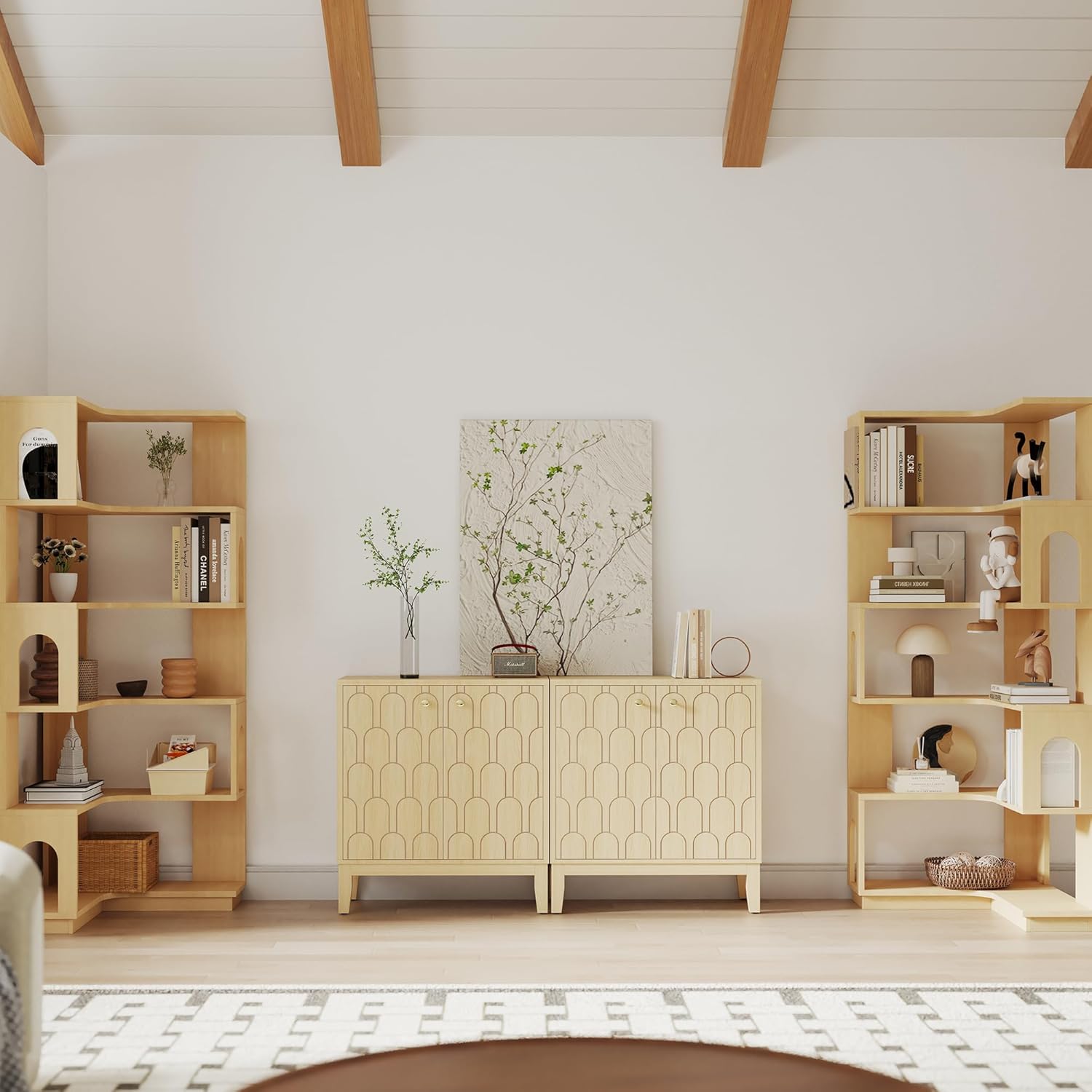 Farmhouse Storage Cabinet, Modern Buffet Sideboard with Doors, Fish Scale Pattern, Boho Cabinet for Dining Room, Natural, 2 Pieces