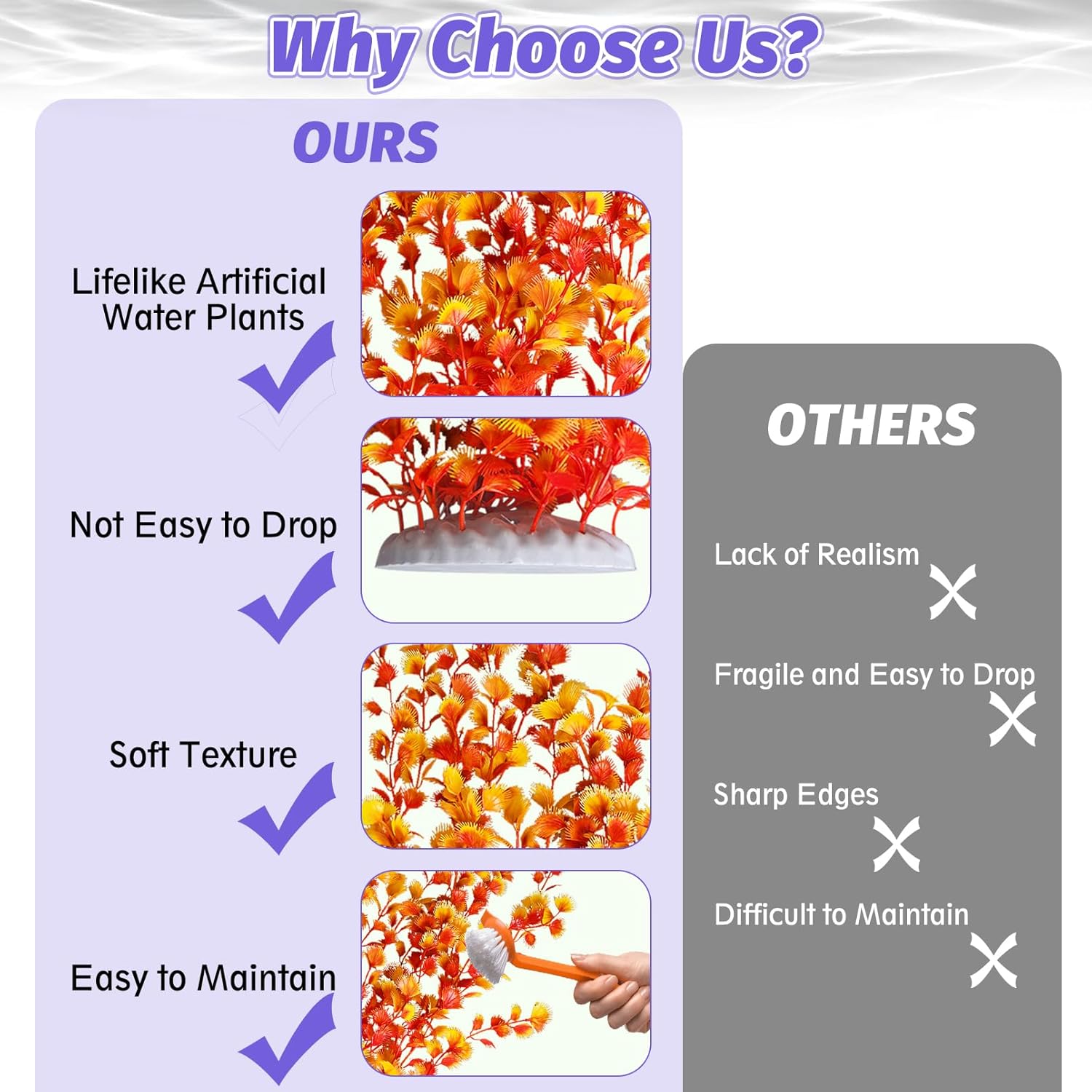- RELIABLE MATERIAL : Our fake water plant leaves and roots are made of soft plastic material that won't affect the water quality. The leaves do not have sharp edges and have a soft texture, which can effectively avoid any physical damage to the fish while swimming or playing, and can better beautify the e-nvironment, maintain stability and not fade. Provide a comfortable and clean living e-nvironment for fish. Whether placed in a saltwater e-nvironment or freshwater e-nvironment, it can be perfectly adapted