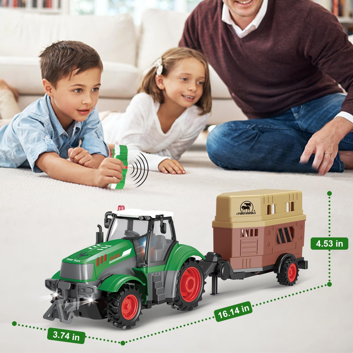 fisca Remote Control Tactor Toy Set & 33PSC Farm Vehicle Playset - Animal Figurines ,2.4GHz 1/24 Scale RC Tractor,Livestock Trailer, Fence with Light for Kids Age 4, 5, 6, 7 and Up Years Old