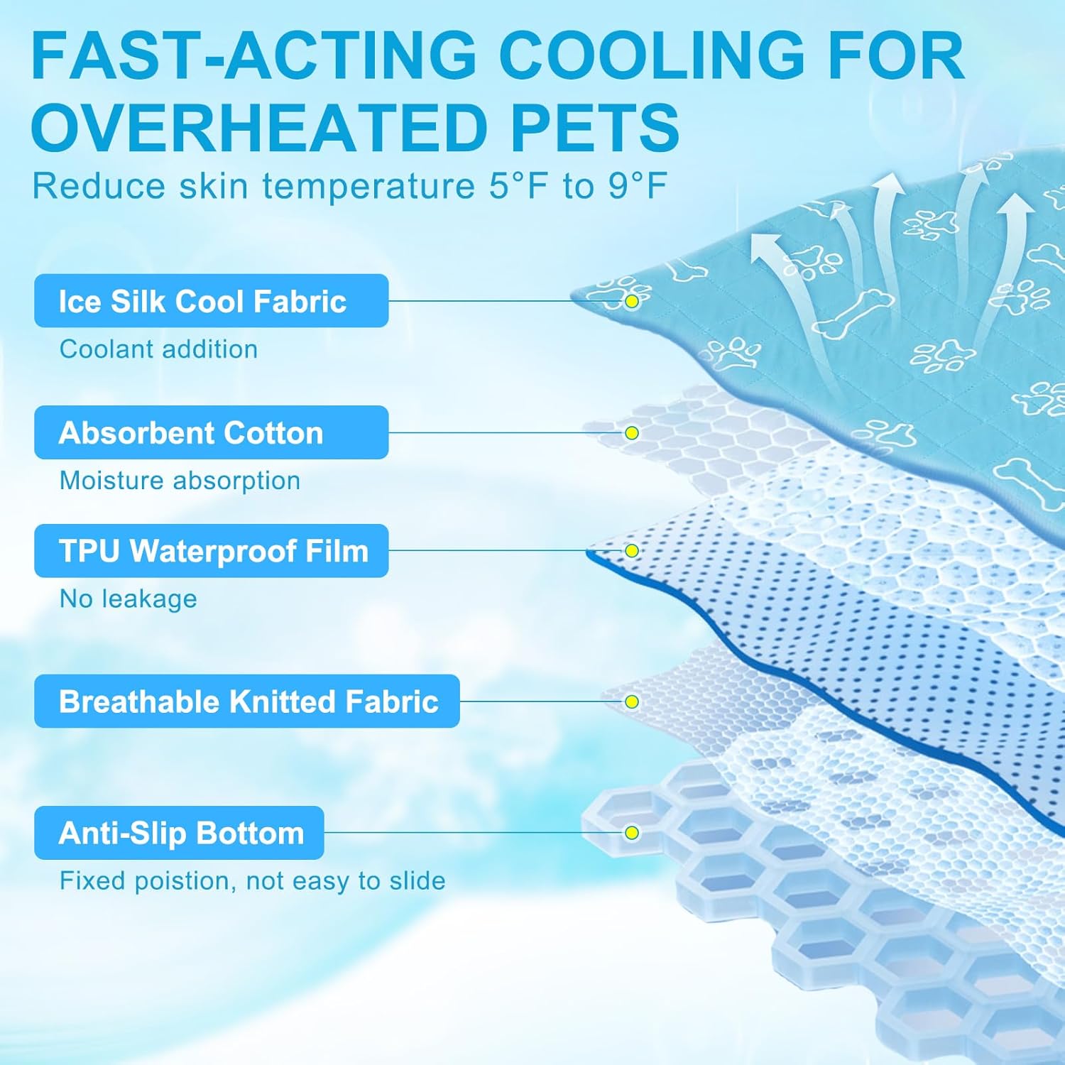 - Anti - slip & Easy Clean-- Designed with non-slip dispensing bottom, prevent from sliding on the floor, also perfect for older animals, or those dealing with joint pain or recovering from surgery. Our pet cooling mat is machine washable, you don't need to spend a lot of time on pet fur and dander, just throw it to the washing machine.