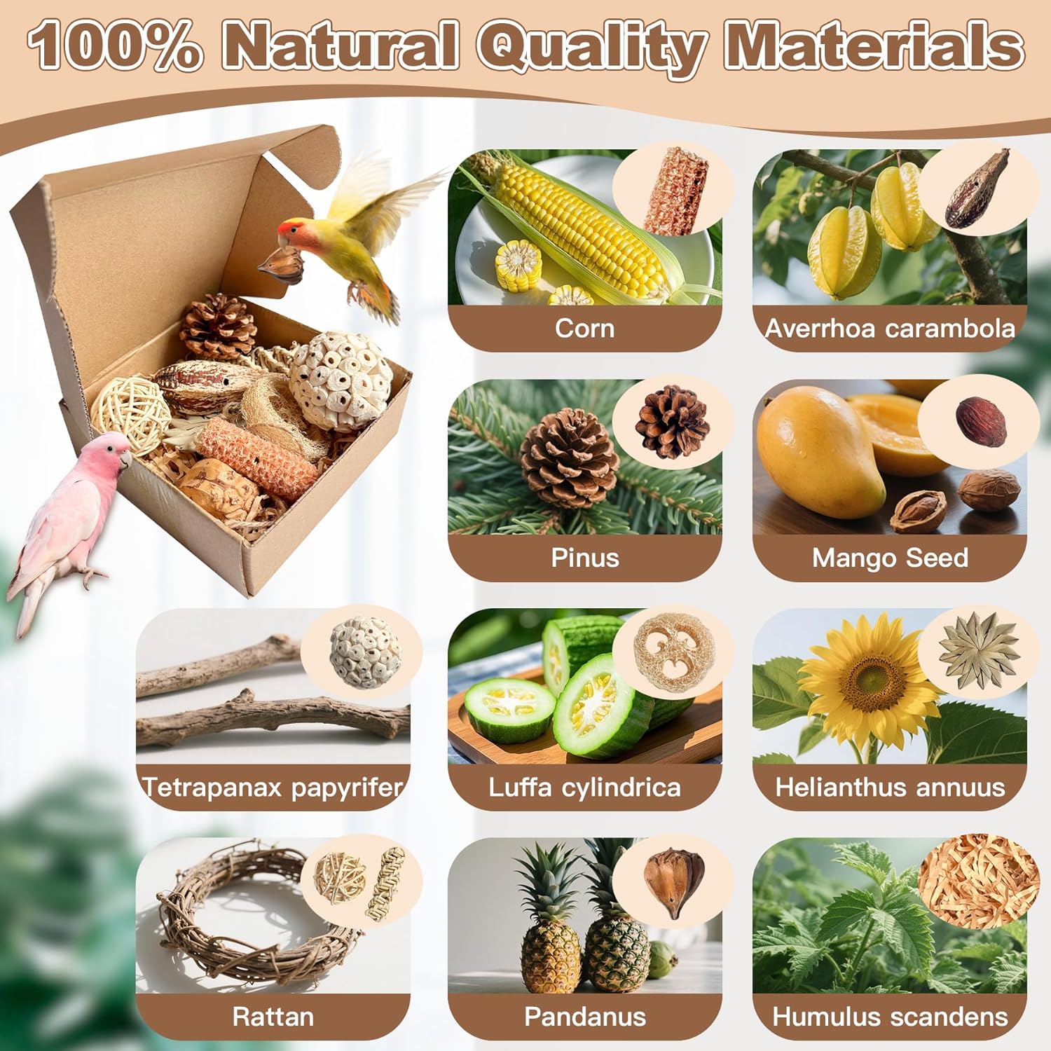- 🦜 PERFECT FOR EVERY BEAK PERSONALITY: Shredders: Crunchy sunflower leaf discs & tearable grass paper Nibblers: Sweet mango wood & textured palm spirals Tossers: Bouncy sola balls & lightweight Ideal for conures, cockatiels, budgies, and more—no bird left behind!