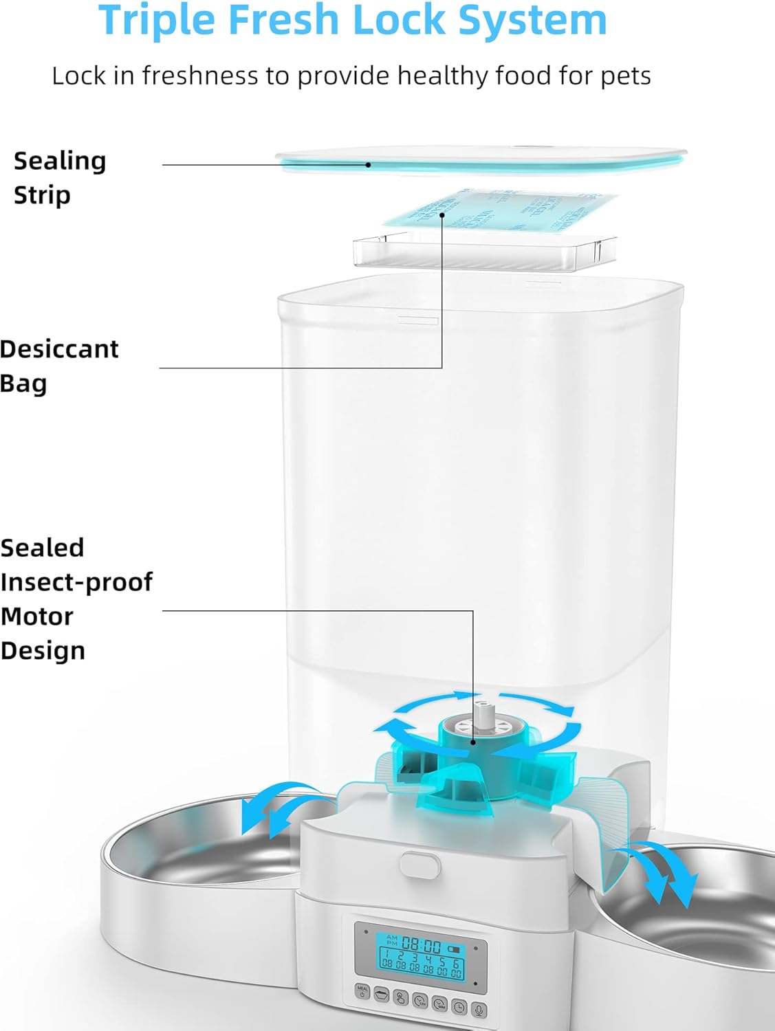 • [Multiple Sealing Keeps Food Fresh] The rubber seal between the lid and the container of the automatic feeder effectively insulates the air to prevent the food from oxidizing and prevents the smell of your pet's food from escaping. There is also a desiccant bag on the lid to dehumidify and prevent moisture. The unique sealed revolving door design in the feeder automatically closes the feeding port after each feeding is completed, preventing ants and insects from entering