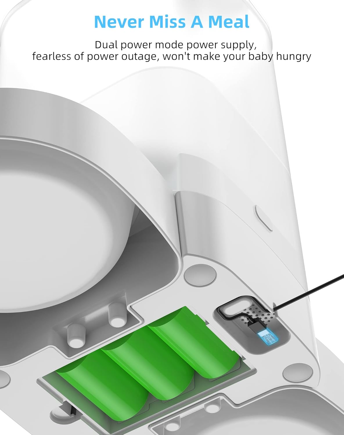 • [Dual Power Supply ] The timed cats feeder can be powered by USB power adapter and 3 alkaline D-size batteries (NOT Included). Once the feeding schedule is set, it is repeated every day. In the event of a power outage, the automatic feeder will automatically switch to battery power. For safety reasons, it is recommended to use Battery power sources. Battery alone can supply power for 200 days.No need to worry about your pet going hungry while you are away.