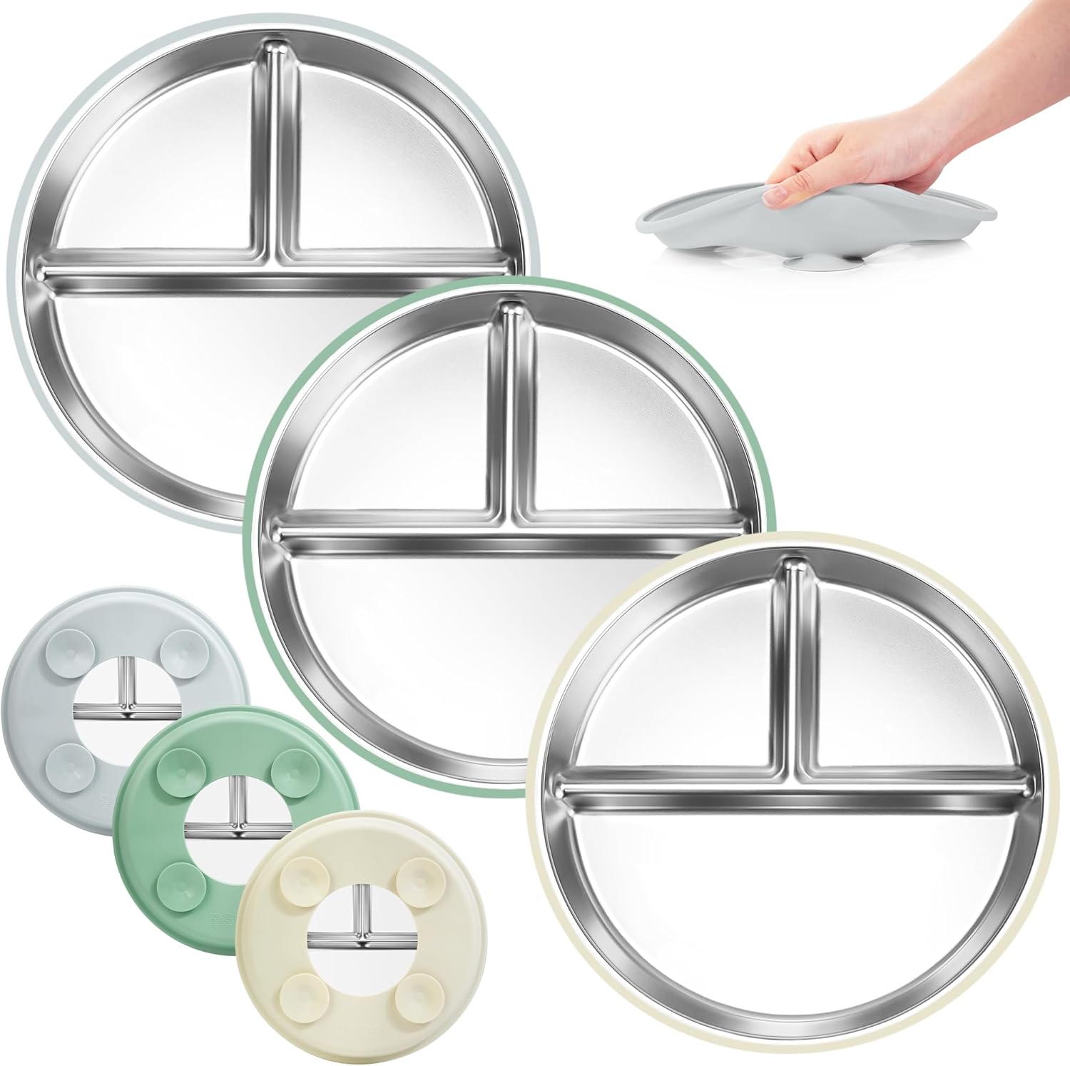 Bella’s Friends Stainless Steel Baby Plates with Suction 3 Pack, 9” Divided Toddler Plates with Removable Silicone Sleeves for Mess-Free Feeding, Non-Toxic, Non-Slip, Dishwasher Safe, Gray,White,Green